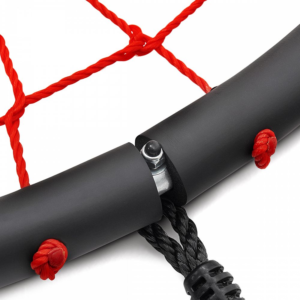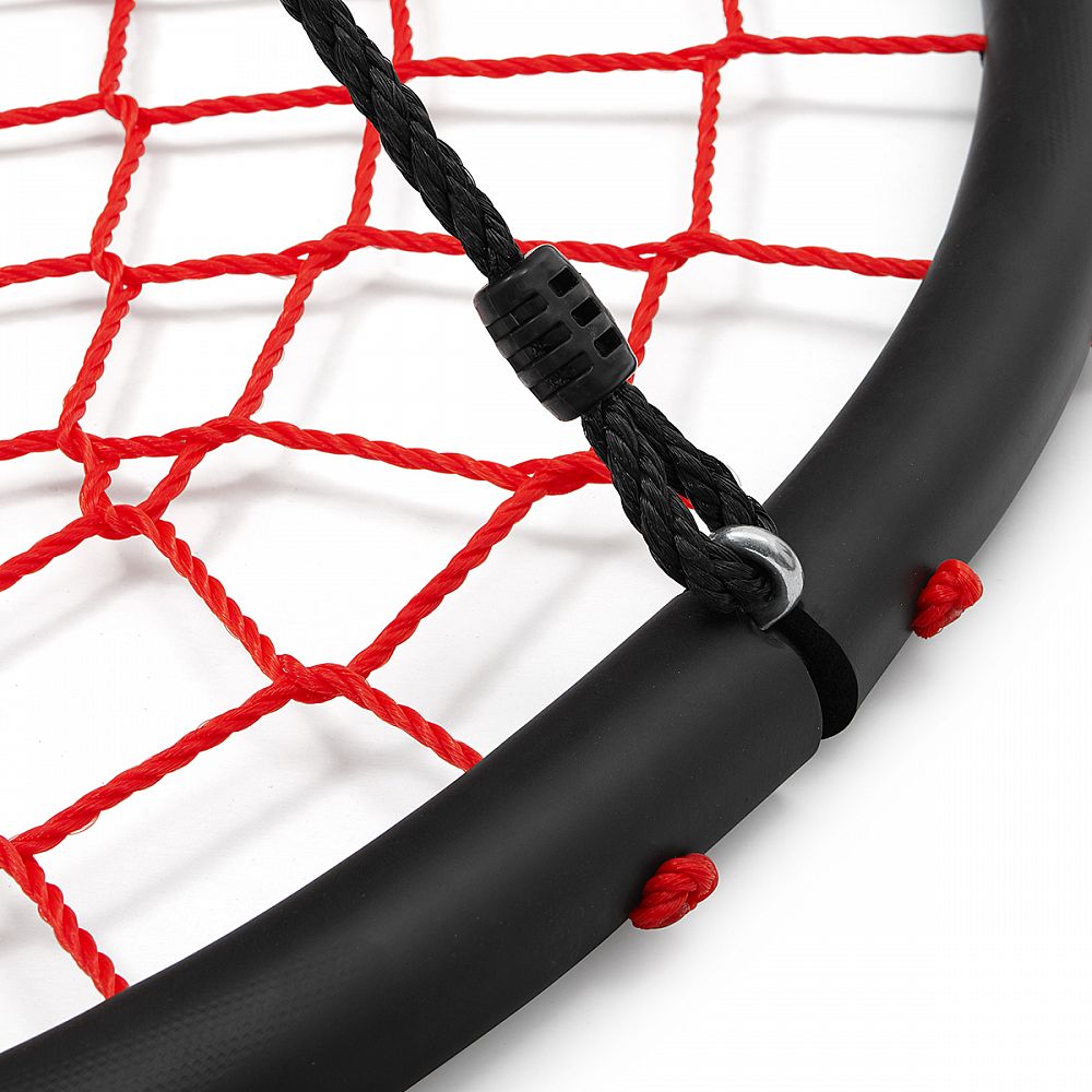Rám s priemerom 100 centimetrov je vyrobený z oceľovej guľatiny s priemerom 25 milimetrov, na ktoré je pre maximálne bezpečie nalepená vysoká vrstva PE peny. Polyetylénový výplet modelu NB5038 má priemer 5 milimetra a je maximálne odolný voči povětrnostím vplyvom ako je dážď a sneh, hniezdo tak nemusíte schovávať keď práve začne pršať. Nosná, polyetylénová lanká majú priemer 10 milimetrov a dĺžku 180 cm. Keď tieto vlastnosti skombinujeme tak získame priestrannú hojdačku s nosnosťou 150 kilogramov, na ktoré sa vybláznia aj viac detí naraz.