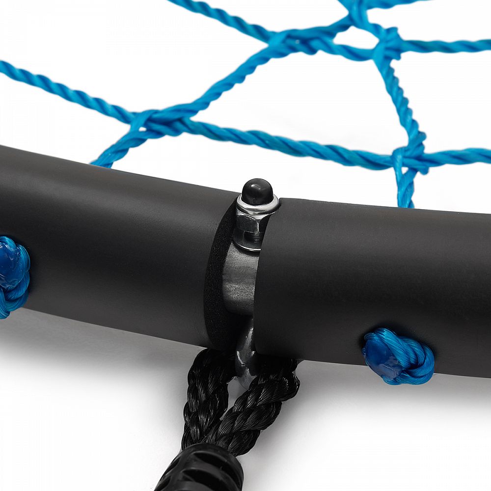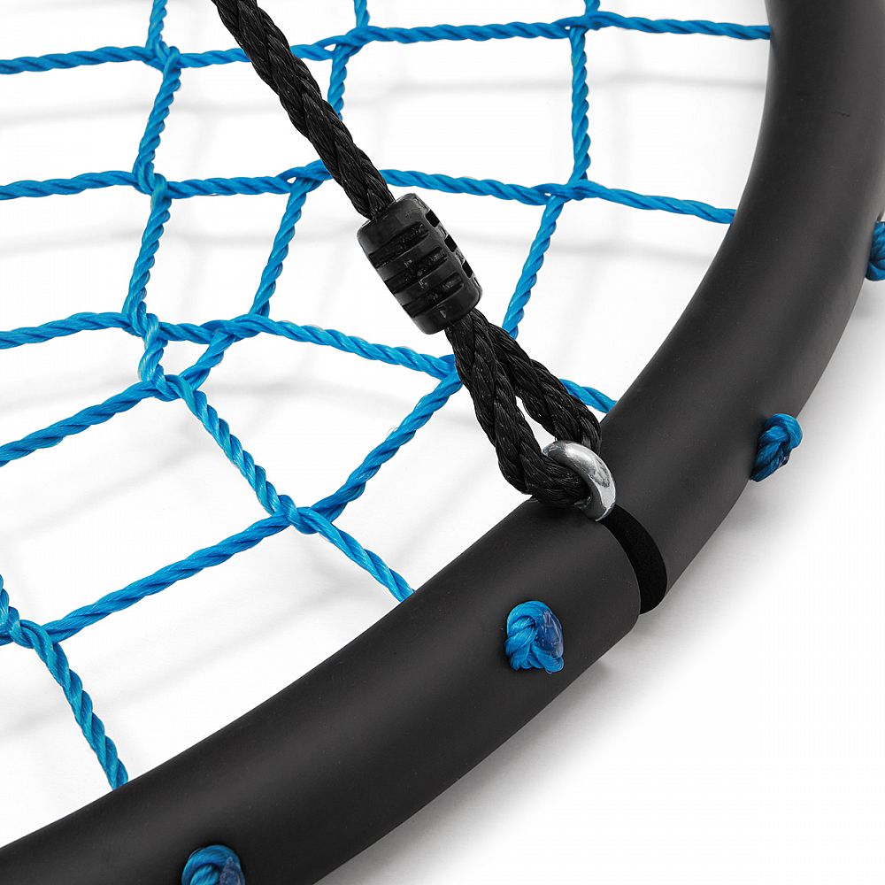 Rám s priemerom 100 centimetrov je vyrobený z oceľovej guľatiny s priemerom 25 milimetrov, na ktoré je pre maximálne bezpečie nalepená vysoká vrstva PE peny. Polyetylénový výplet modelu NB5038 má priemer 5 milimetra a je maximálne odolný voči povětrnostím vplyvom ako je dážď a sneh, hniezdo tak nemusíte schovávať keď práve začne pršať. Nosná, polyetylénová lanká majú priemer 10 milimetrov a dĺžku 180 cm. Keď tieto vlastnosti skombinujeme tak získame priestrannú hojdačku s nosnosťou 150 kilogramov, na ktoré sa vybláznia aj viac detí naraz.
