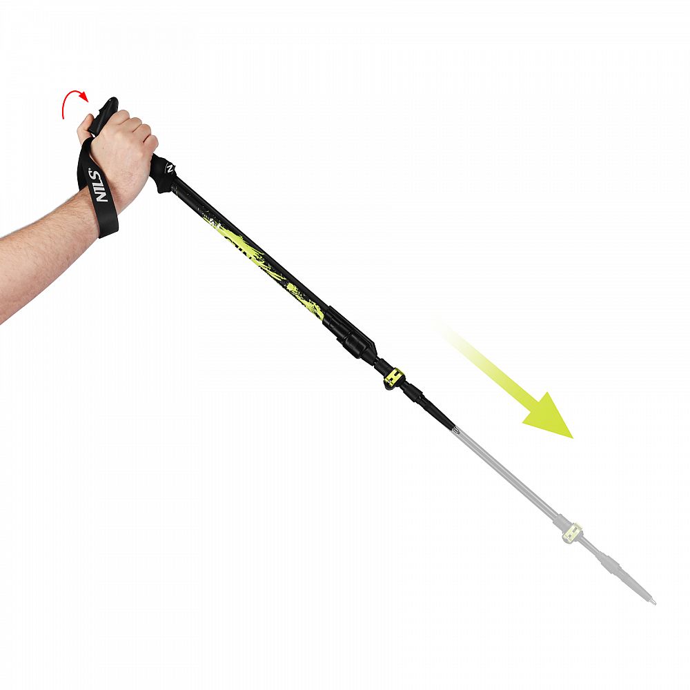 Dĺžka spodného segmentu palice sa nastavuje manuálne a uzamyká sa hliníkovým zámkom. Dĺžka stredného segmentu sa nastavuje pri stlačenom tlačidle na hornej strane rukoväte a palice tak ide upraviť bez potreby zastavenia.