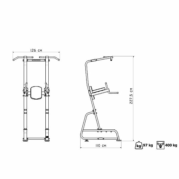 Komfortnému cvičenia napomáhajú penové úchyty, pohodlné polstrovanie, alebo naklonené podpery rúk. Robustný a stabilnú konštrukciu zaručuje hmotnosť 97 kg a použitý profil 80 x 40 x 3 mm.