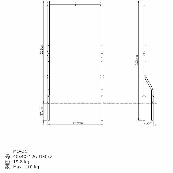 Hrazda je umiestnená vo výške 225 cm a poskytuje pohodlný úchop. Vďaka tomu môžete vykonávať širokú škálu silových a posilňovacích cvikov pre svaly hornej polovice tela. Ide o riešenie pre začiatočníkov i pokročilých užívateľov!