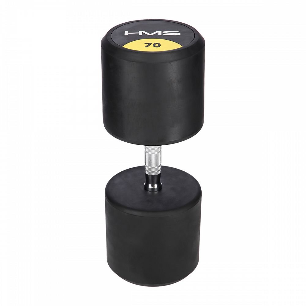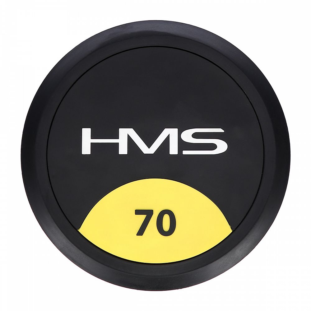 70-tich kilogramová jednoručná činka HMS HG Pro je určená pre profesionálne použitie ako doma tak v posilňovni. Závažie tvorí liatinový odliatok pokrytý hrubou vrstvou gumy, ktorá ochráni ako činku, tak podklad pred poškodením. Na čelnej strane je značka HMS a údaj o hmotnosti v kilogramoch. Rukoväť je vyrobená z chrómovanej ocele, pre pohodlný úchop má súdkovitý tvar s vrúbkovaním. povrchom.