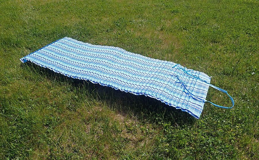 Plážové rolovacie lehátko modré - nový a veľmi skladný typ lehátka o rozmere 170 x 55 x 1,5 cm. Výplňou sú rúrky z nenasiaklivého molitanu, do seba vzájomne zapadajúce a umožňujúce úsporné zloženie lehátka do úhľadného balíčka. Rozmer balíčka je 9,5 cm priemer x 55 cm dĺžka. Poťah je bavlnený s prímesou polyesteru kvôli obmedzeniu nasiaklivosti.