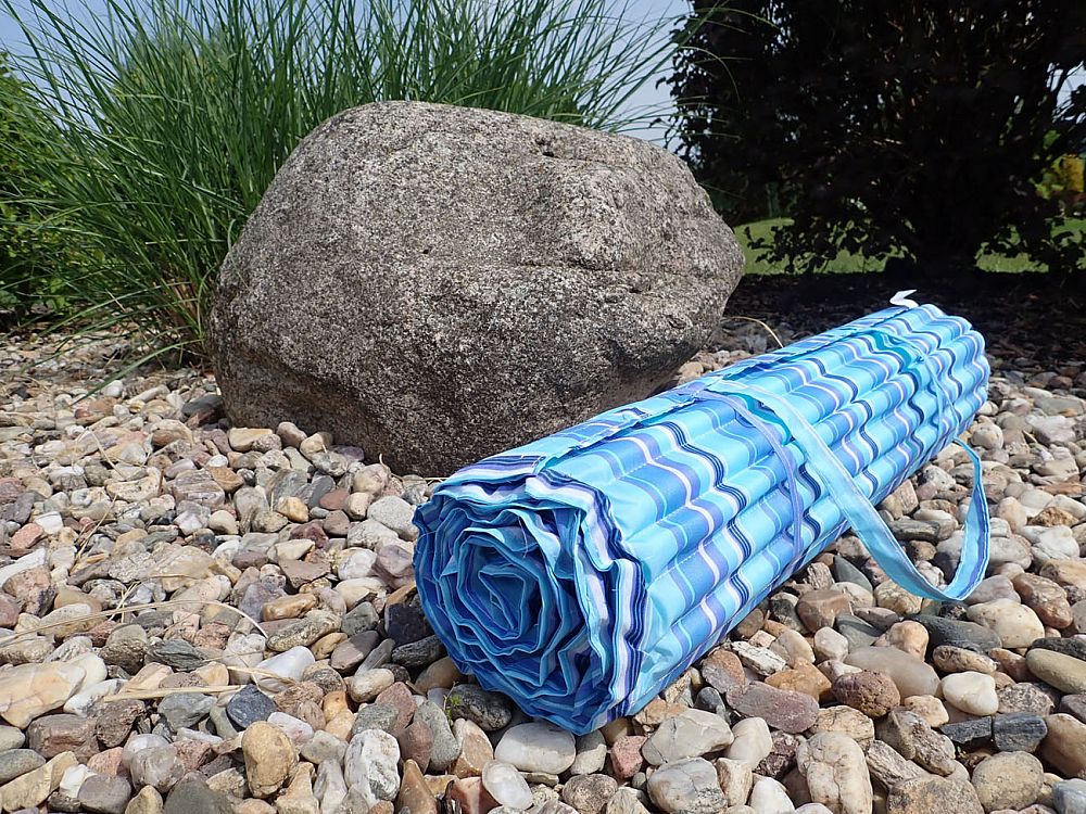 Plážové rolovacie lehátko modré - nový a veľmi skladný typ lehátka o rozmere 170 x 55 x 1,5 cm. Výplňou sú rúrky z nenasiaklivého molitanu, do seba vzájomne zapadajúce a umožňujúce úsporné zloženie lehátka do úhľadného balíčka. Rozmer balíčka je 9,5 cm priemer x 55 cm dĺžka. Poťah je bavlnený s prímesou polyesteru kvôli obmedzeniu nasiaklivosti. NEPRAT V PRÁČKE, ale iba ručne v mydlovej vode. Nežmýkať!