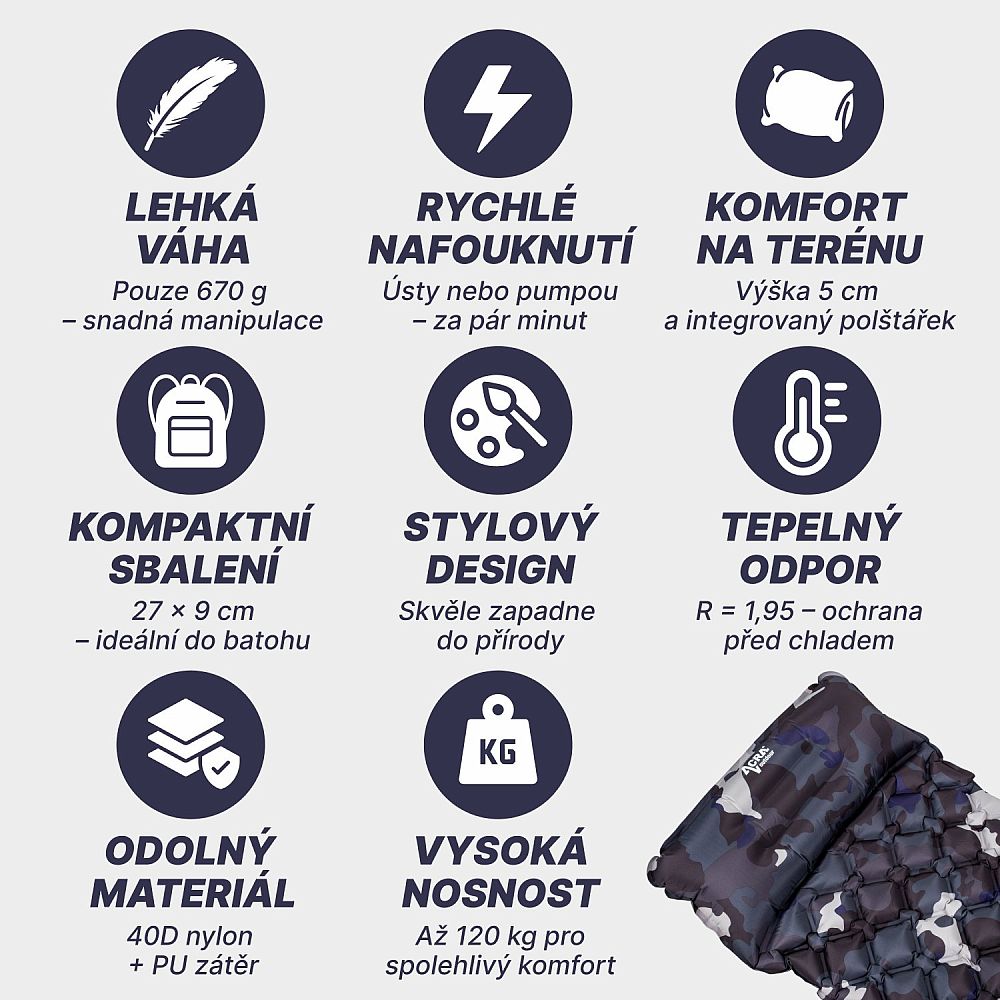 - Pohodlné ležanie: Karimatka je vybavená nafukovacím vankúšikom a nafukovacími komorami po celej ploche pod telom, takže vám zaistí maximálne pohodlie aj na nerovnom teréne.
