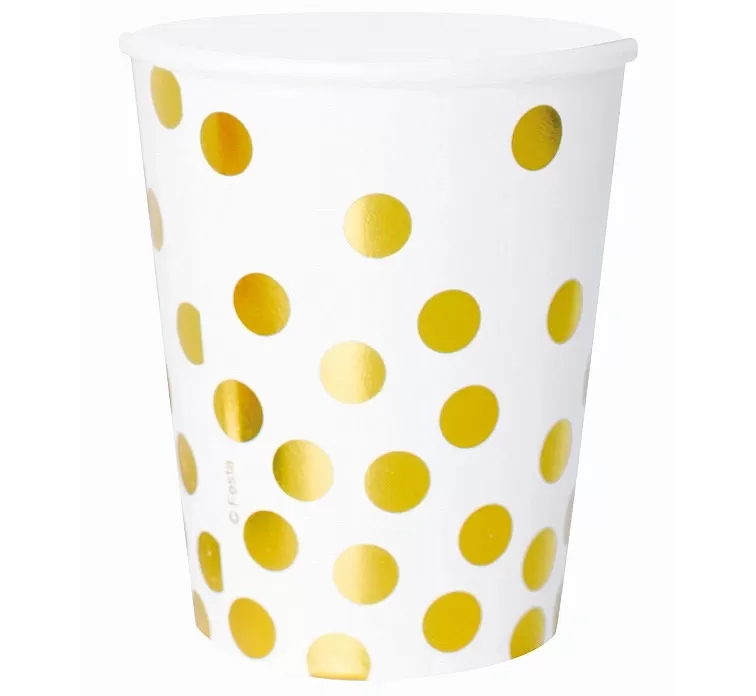 Sada šiestich bielych ozdobných papierových kelímkov s motívom zlatých konfiet s objemom 270ml.