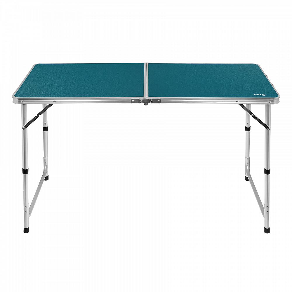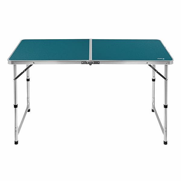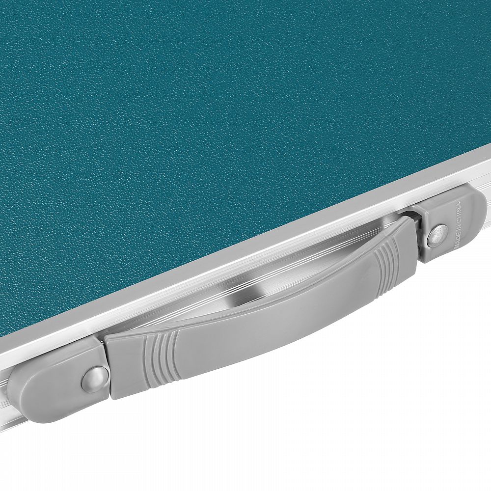 Stôl má dosku s rozmermi 120 x 60 cm, ktorá je vyrobená z laminovanej MDF dosky. Pevná, ľahká hliníková konštrukcia zaisťuje odolnosť a stabilitu. Výšku stola je možné nastaviť v troch úrovniach (55, 61,5 a 70 cm), čo umožňuje pohodlné používanie ako deťom, tak dospelým. Stôl sa jednoducho skladá – po zložení nôh a „preložení“ na polovicu vznikne kompaktný kufrík s rozmermi 60 x 60 x 6,5 cm. Na boku je praktická rukoväť, ktorá uľahčuje prenášanie celej sady.