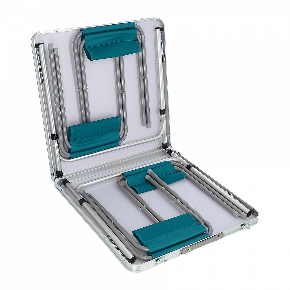 Štyri stoličky majú hliníkový rám a sedáky z odolného polyesteru. Po rozložení má každá stolička výšku 35 cm a plocha sedadla je 27 x 25 cm. Po zložení sa stoličky pohodlne uložia dovnútra zloženého stola (kufríka), čo šetrí miesto a robí z celej sady veľmi kompaktný celok.