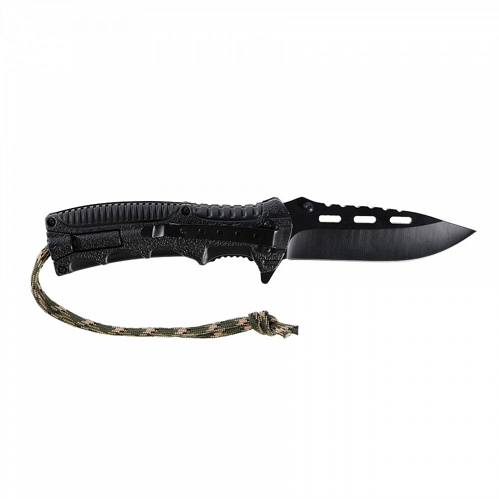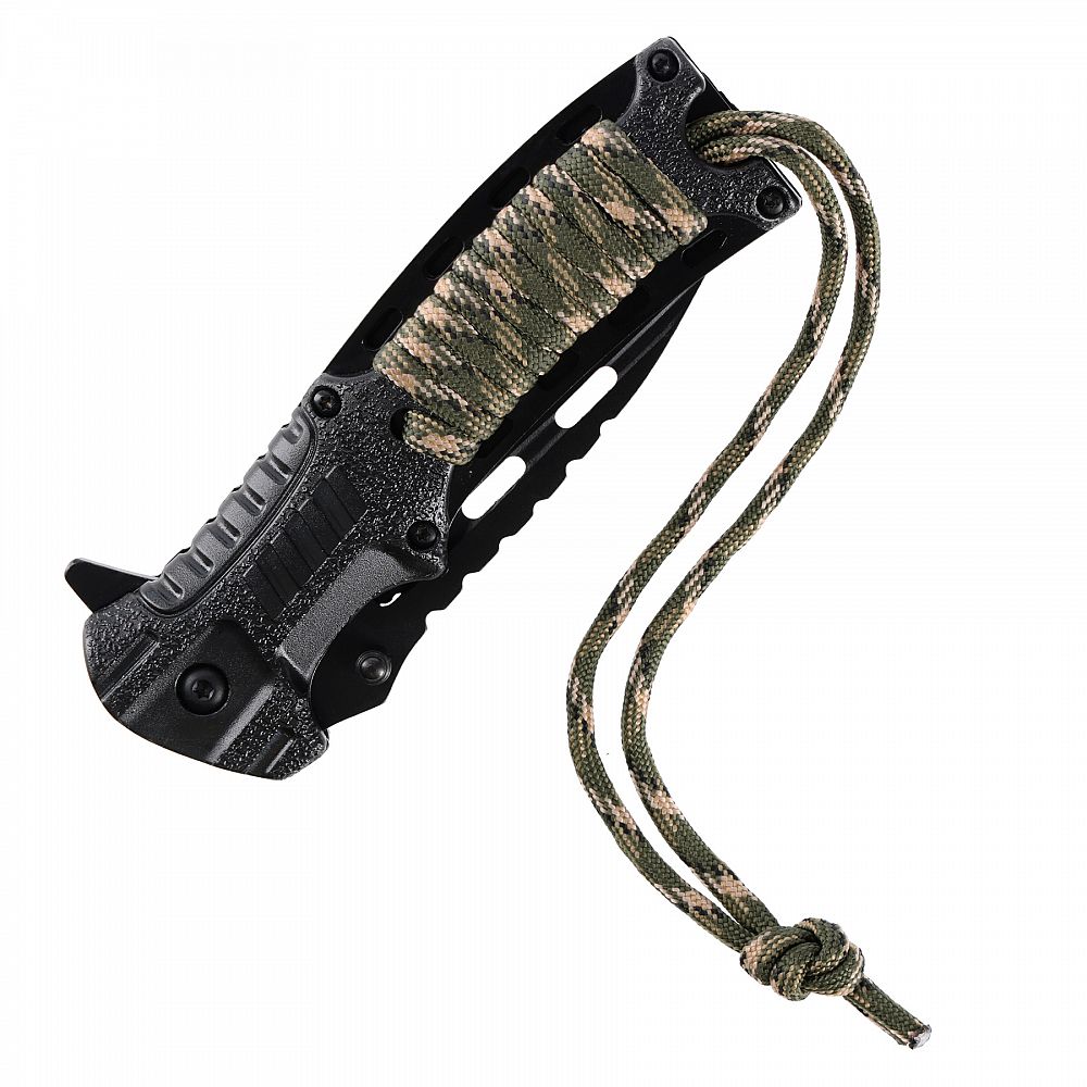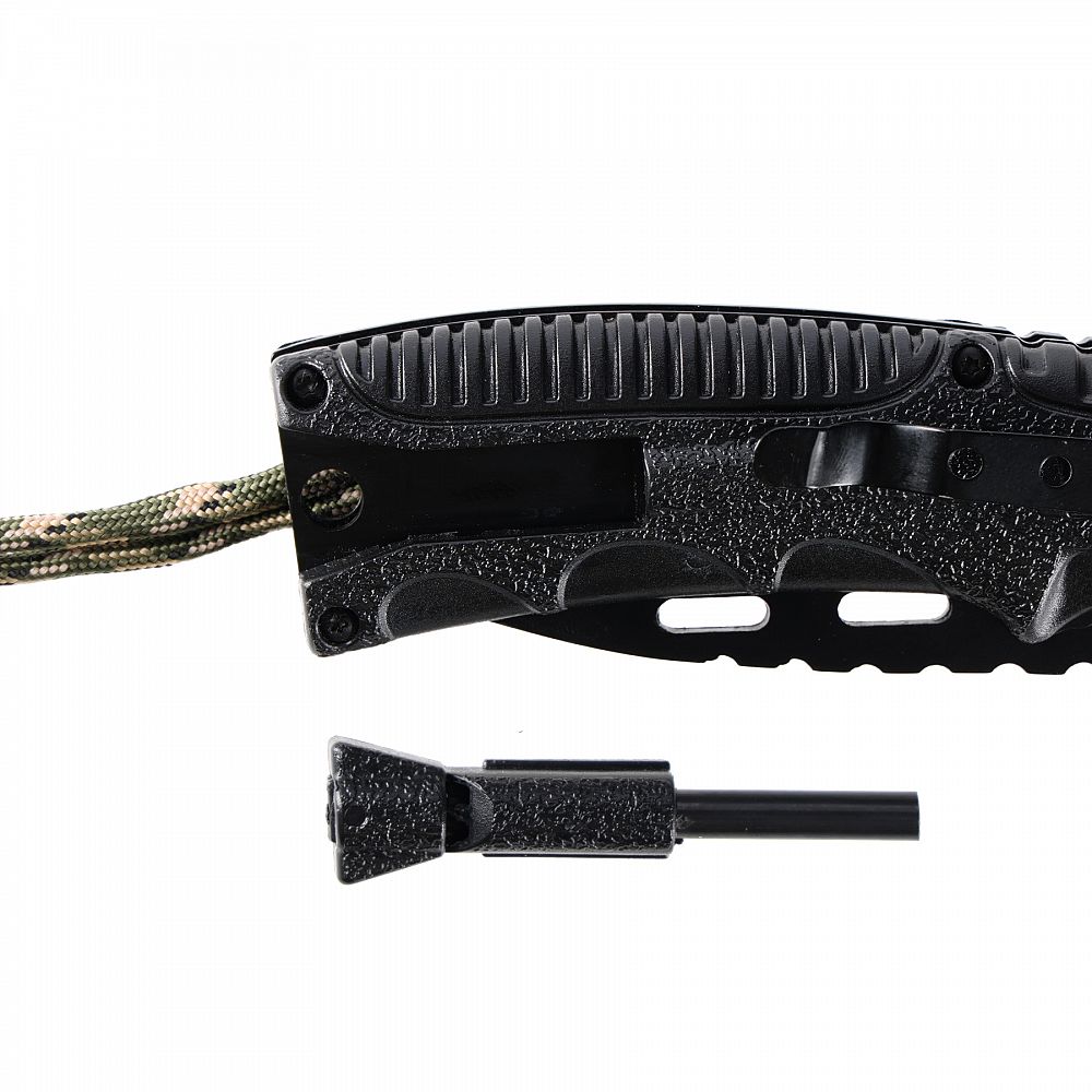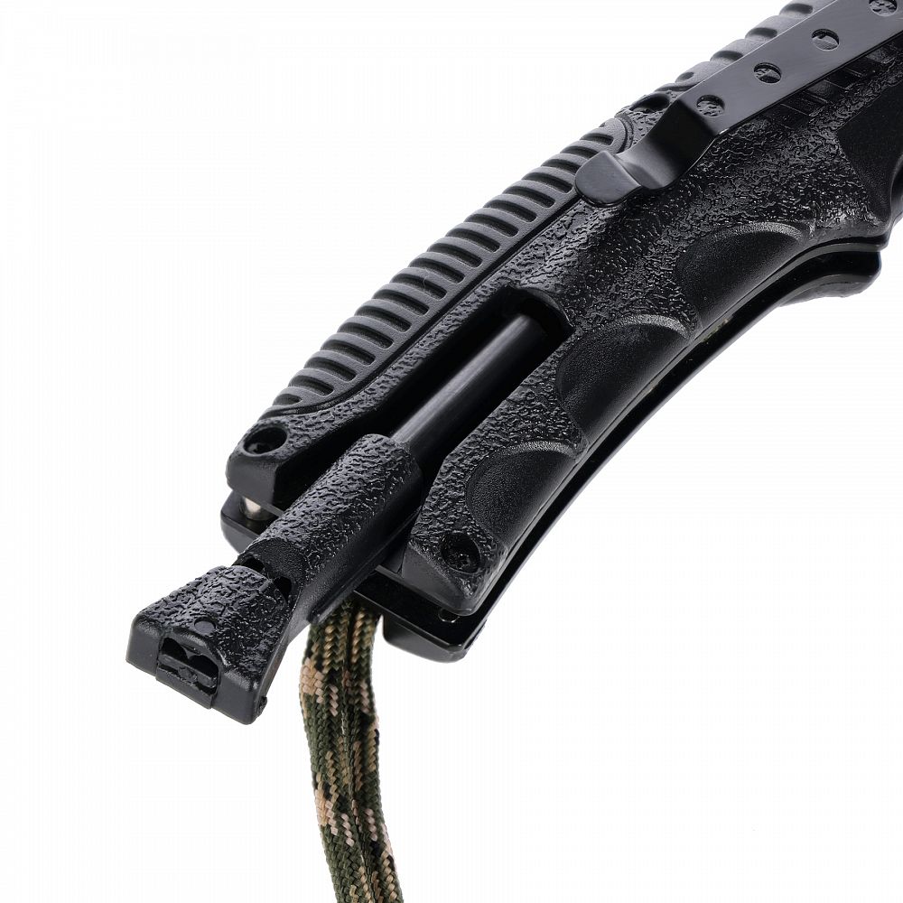 Rukoväť noža je omotaná približne 50 cm paracordu, ktorý je možné použiť ako núdzovú šnúru. Píšťalka a kresadlo umiestnené v rukoväti zvyšujú funkčnosť noža, takže je nielen rezným nástrojom, ale aj pomôckou na prežitie. Praktický klip umožňuje pripevniť nôž na okraj vrecka, opasku alebo vybavenia na rýchly prístup a bezpečné nosenie.