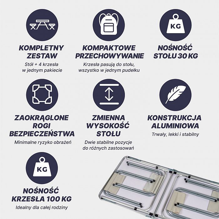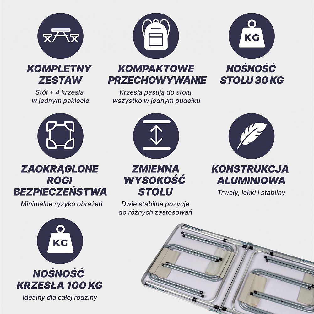 - Kompaktný a skladný: Vďaka premyslenému dizajnu sa stôl a stoličky ľahko skladajú a zmestia sa do seba, takže zaberú minimum priestoru v batohu alebo aute.