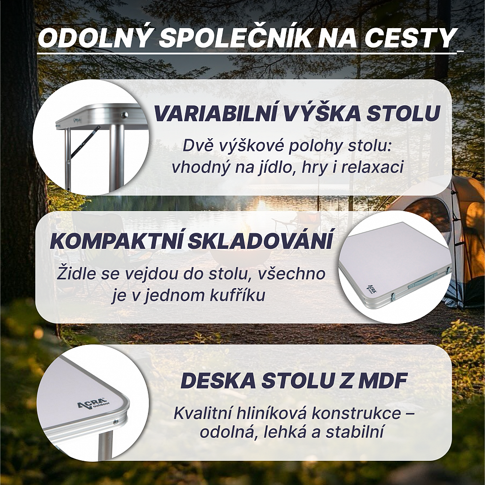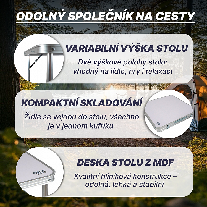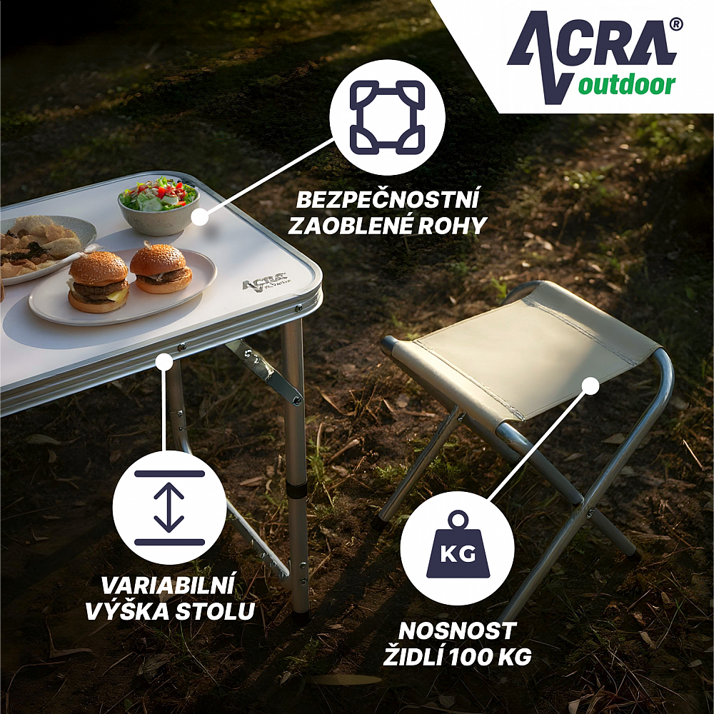 Kempingový set Acra C3L je ideálnou voľbou pre všetkých, ktorí si cenia praktického, odolného a štýlového nábytku. Je perfektný pre rodinné výlety, do karavanu aj na chatu.