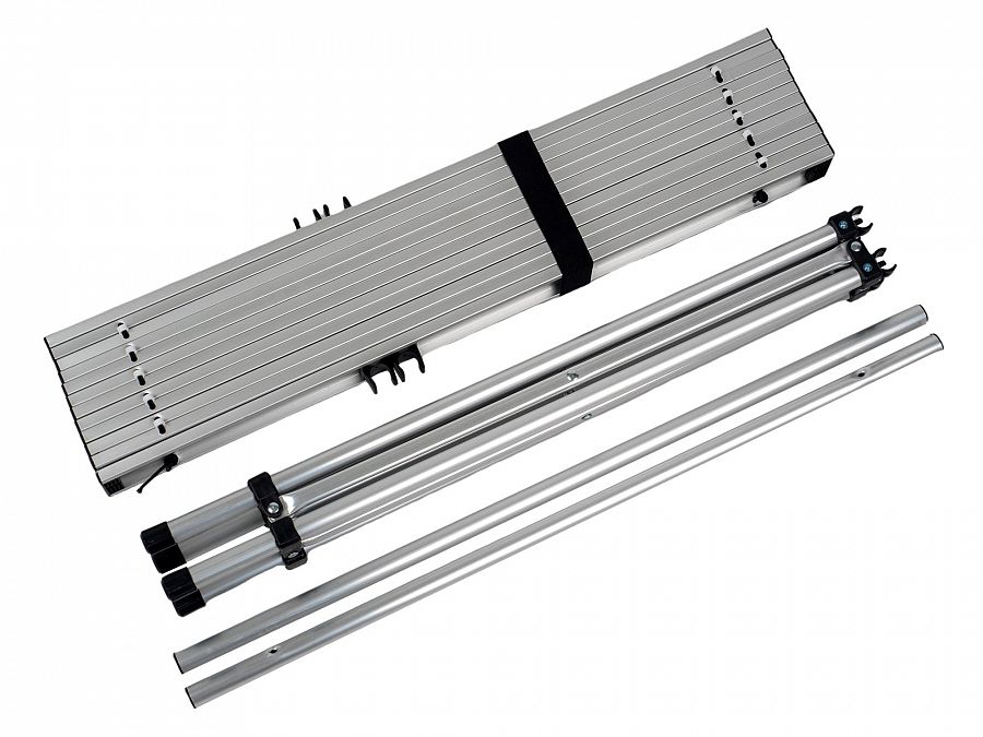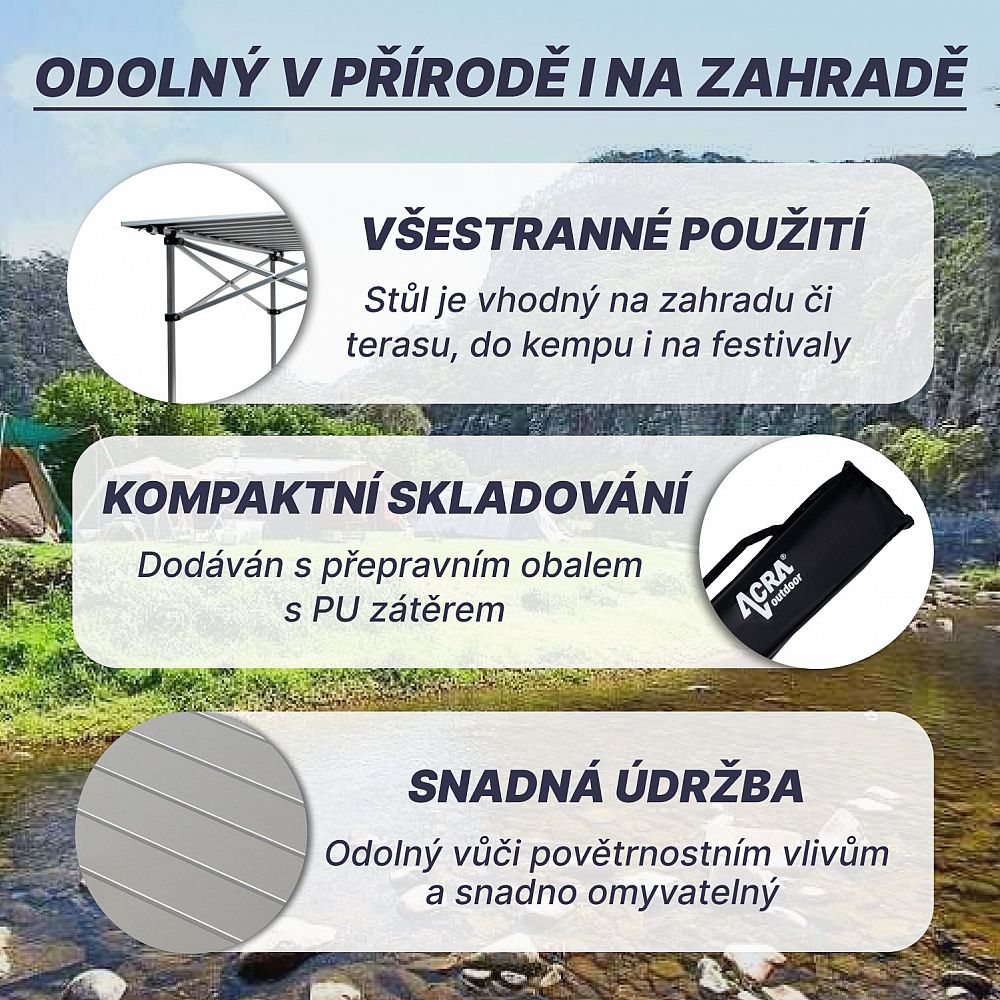 - Odolná konštrukcia: Pevná hliníková konštrukcia zaručuje stabilitu stola aj pri nerovnom teréne.