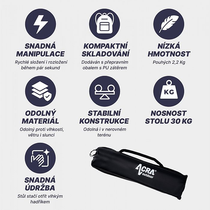 - Ľahká váha: Vďaka nízkej hmotnosti 2,2 kg sa stôl ľahko prenáša.