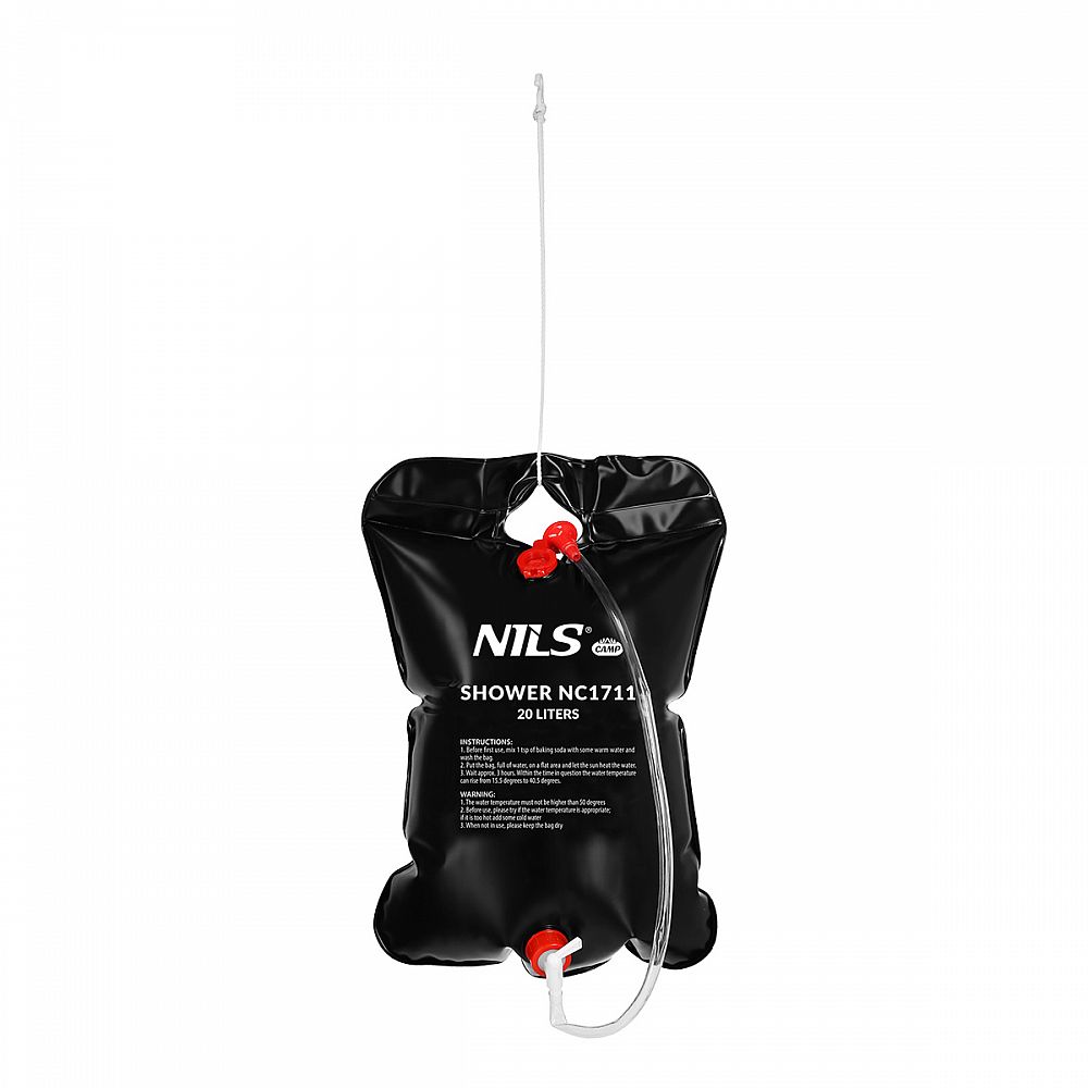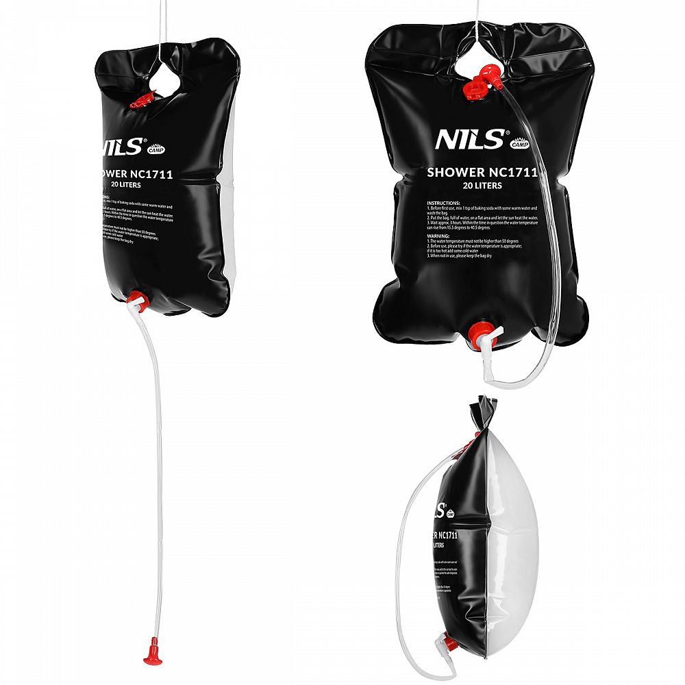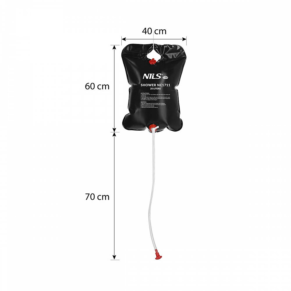 Prenosná turistická sprcha NC1711 od NILS Camp s objemom 20 litrov, ktorá je skvelým riešením pre každého, kto trávi čas kempovaním, cestovaním alebo kdekoľvek, kde nie je prístup do kúpeľne s teplou vodou.