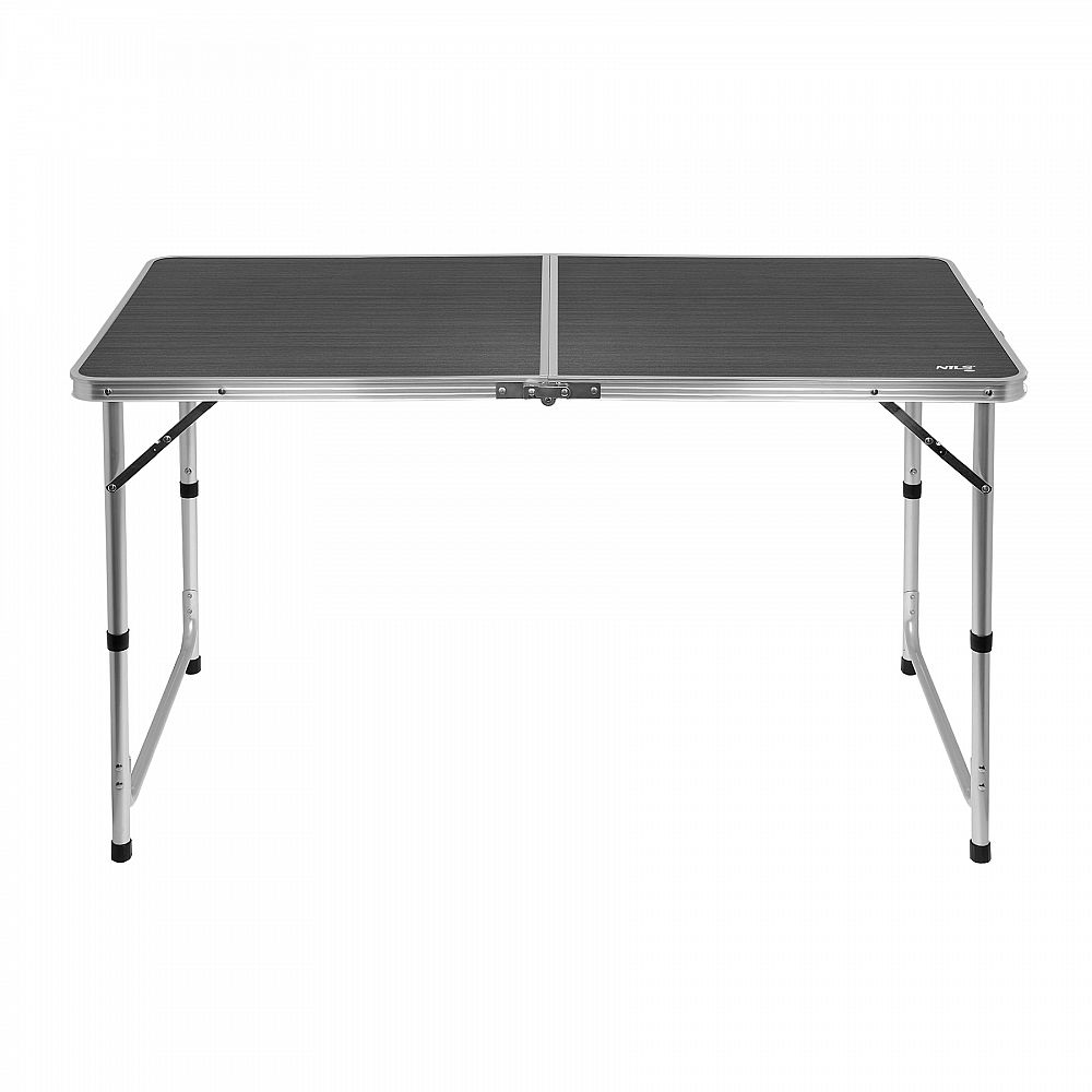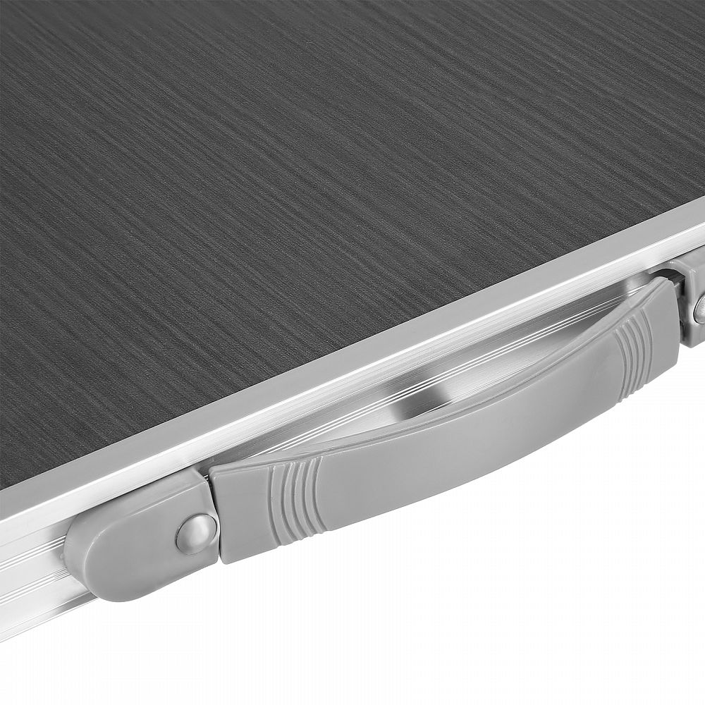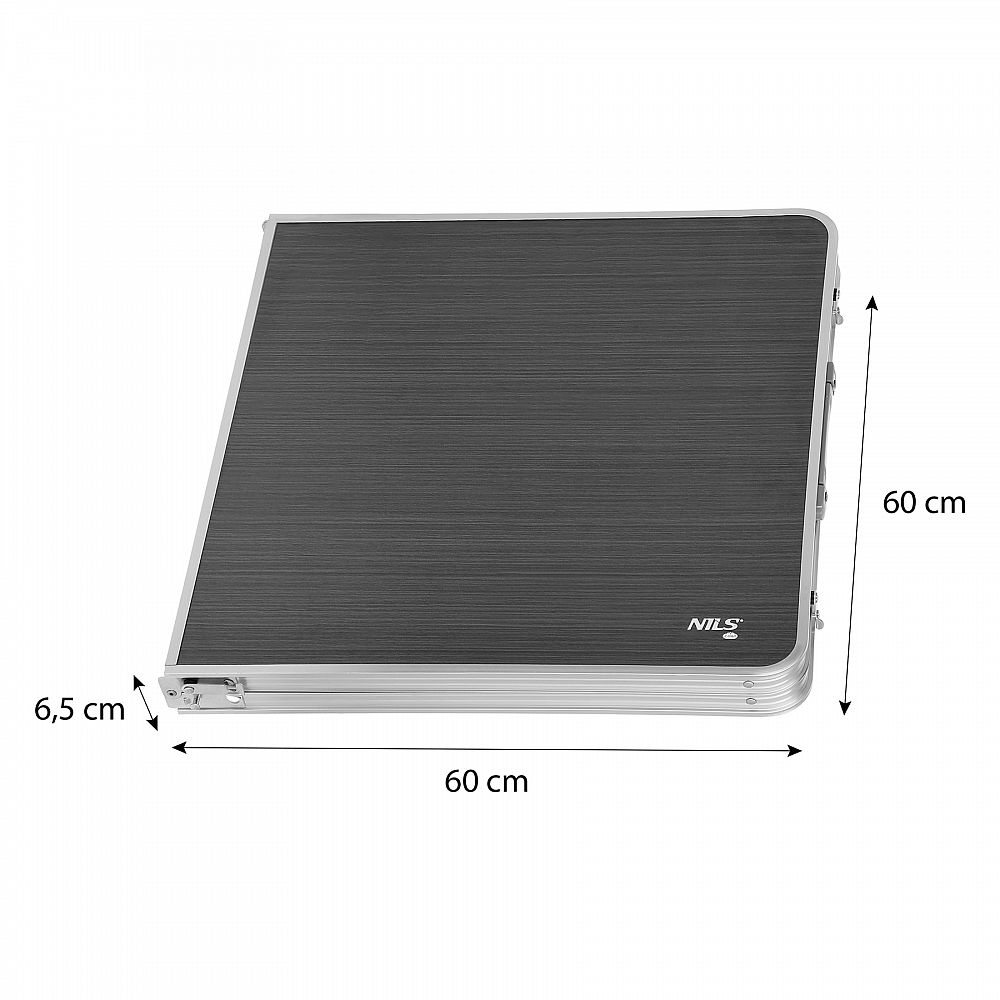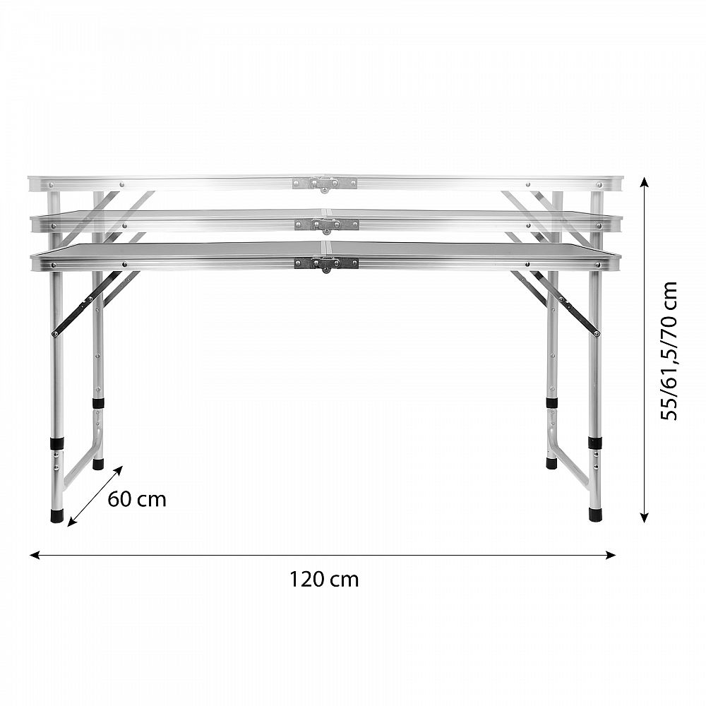 Stôl má dosku s rozmermi 120 x 60 cm, ktorá je vyrobená z laminovanej MDF dosky. Pevná, ľahká hliníková konštrukcia zaisťuje odolnosť a stabilitu. Výšku stola je možné nastaviť v troch úrovniach (55, 61,5 a 70 cm), čo umožňuje pohodlné používanie ako deťom, tak dospelým. Stôl sa jednoducho skladá – po zložení nôh a „preložení“ na polovicu vznikne kompaktný kufrík s rozmermi 60 x 60 x 6,5 cm. Na boku je praktická rukoväť, ktorá uľahčuje prenášanie celej sady.