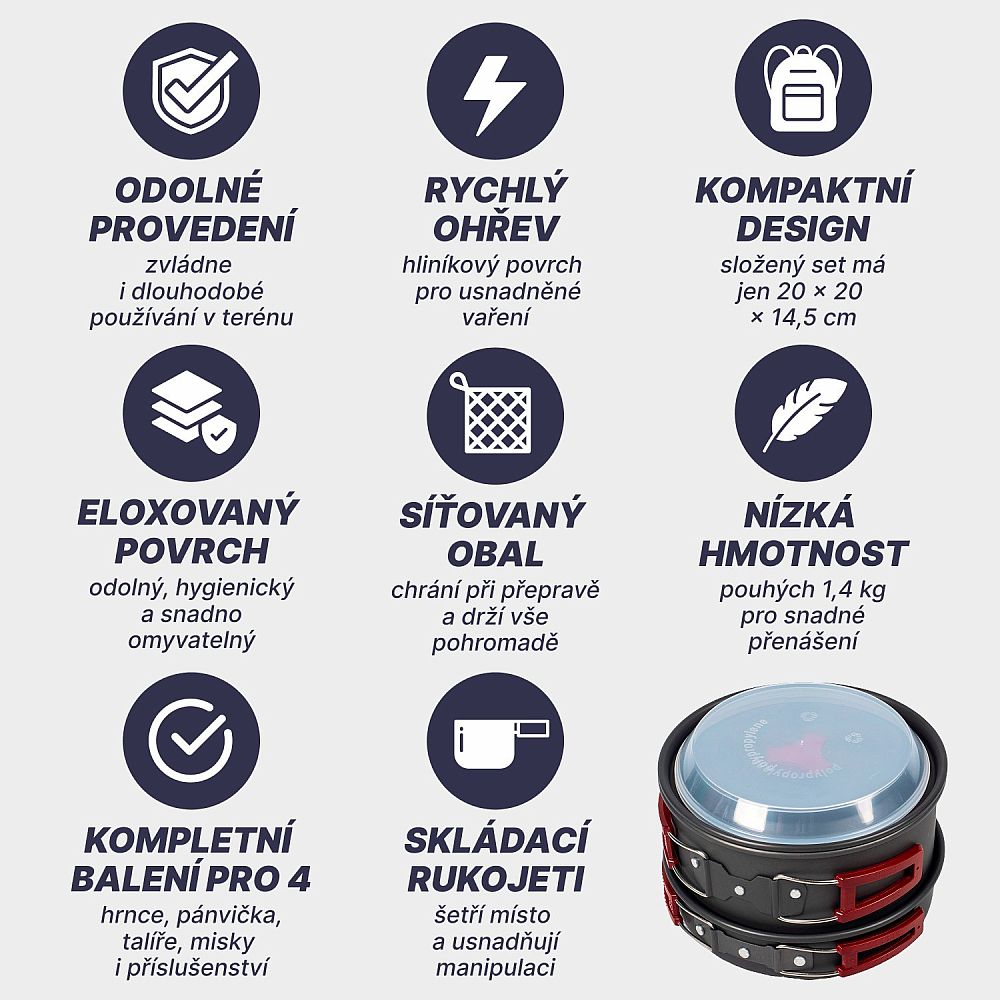 - Odolné materiály: Sada je vyrobená z odolnej hliníkovej zliatiny a plastu, takže vydrží aj náročné outdoorové podmienky.