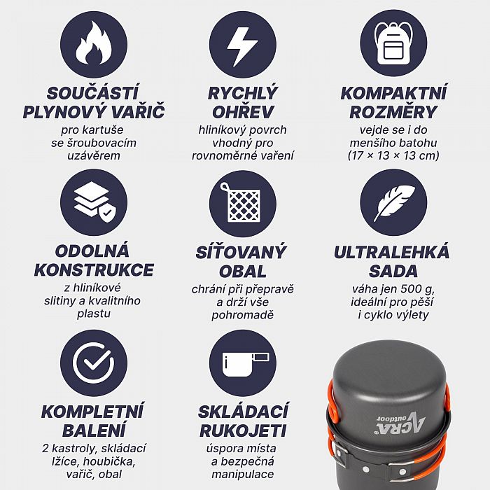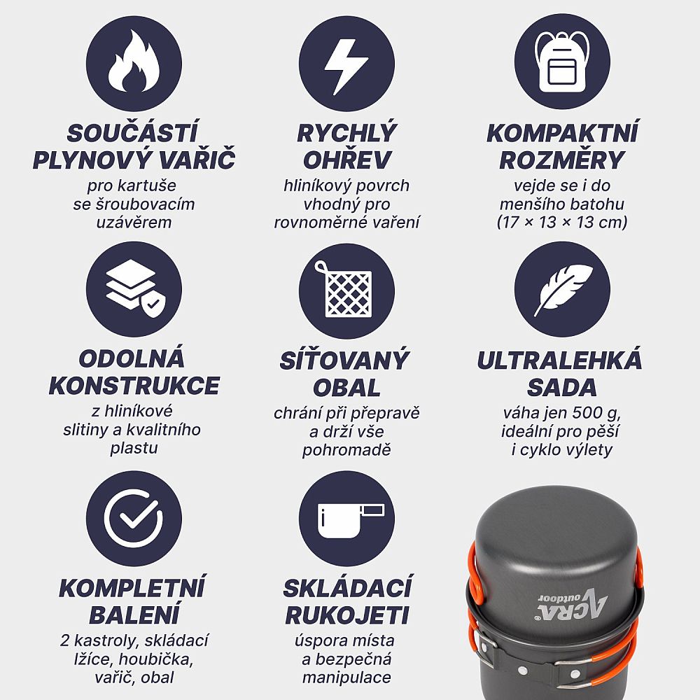 Hľadáte kompaktný a ľahký riad, ktorý vám uľahčí varenie na krátkych turistických výletoch a kempovaní? Potom je ultraľahká sada riadu Acra C23 od firmy Acra Sport ideálnou voľbou! Sada obsahuje všetko, čo potrebujete na prípravu jedla pre 1-2 osoby, a je vyrobená z odolných a ľahkých materiálov, ktoré vám uľahčia prenášanie.