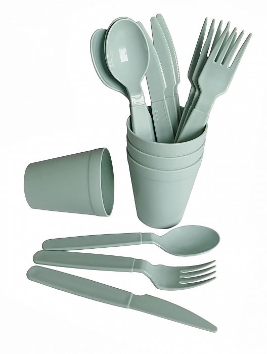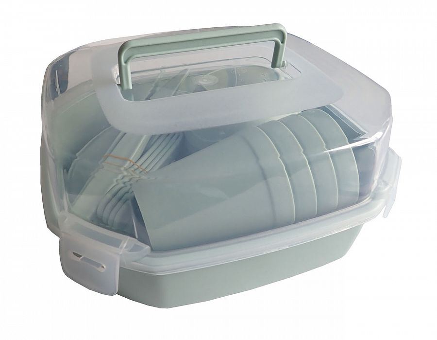 Kempingová sada plastového riadu sa skladá z 26 ks súčastí. Obsahuje 4 plastové taniere s priemerom 23,5 cm, 4 plastové tégliky s objemom 250 ml, 4 plastové misky s objemom 0,35 l, 4 plastové lyžice 18,8 cm, 4 plastové vidličky 18,5 cm, 4 plastové nože 18,7 cm. Všetko uzavreté v praktickej dvojdielnej dóze s uchom a oddeliteľným vekom, ktorá poslúži aj ako ďalší riad.