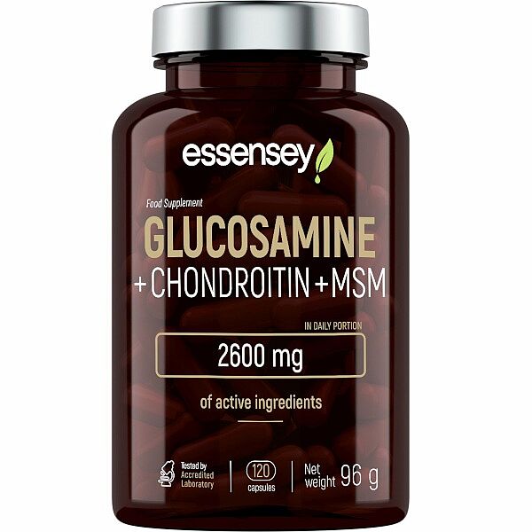 ESSENSEY GLUCOSAMINE + CHONDROITIN + MSM. Výživový doplnok. Liek v kapsulách s obsahom glukosamín sulfátu, chondroitín sulfátu a metylsulfónylmetánu.