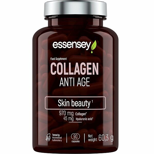 ESSENSEY COLLAGEN ANTI AGE. Výživový doplnok. Výrobok v kapsuliach s obsahom hydrolyzátu kolagénu typu I SOLUGEL®, vitamínu C a kyseliny hyalurónovej. Vitamín C prispieva k normálnemu vstrebávaniu kolagénu pre normálnu funkciu pokožky.