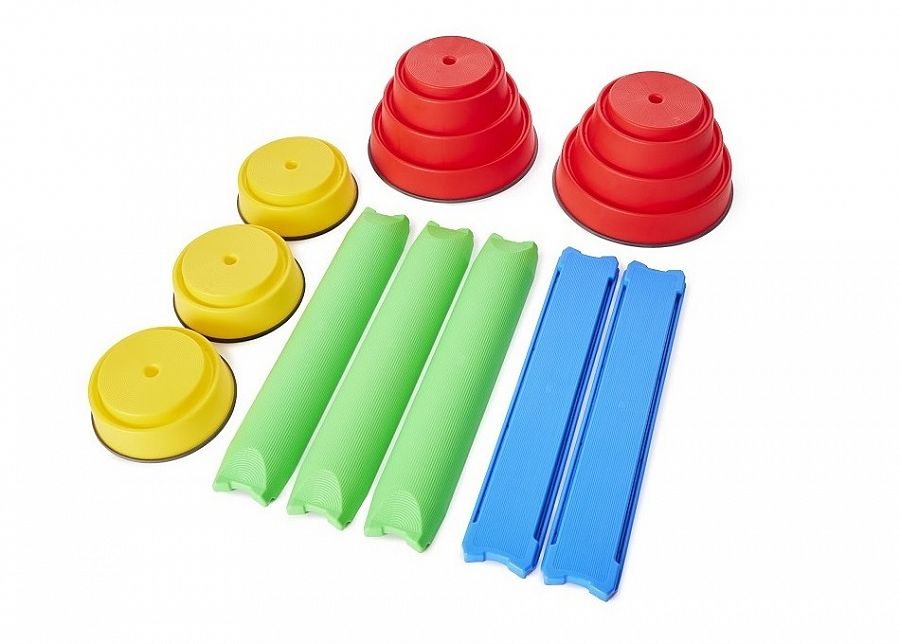 Balenie obsahuje: 3x Červený ostrov TOP24 Ø 40cm, výška 24 cm (možno nastaviť na výšku 10, 17 a 24 cm), 2x Žltý ostrov TOP10 Ø 27 cm, výška 10 cm, 5x Modrá lávka 72 x 13 cm