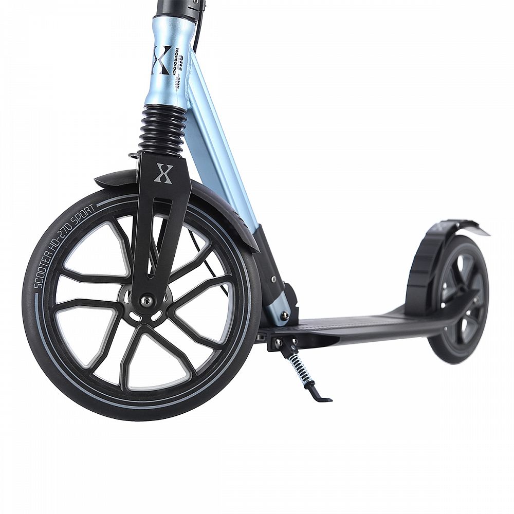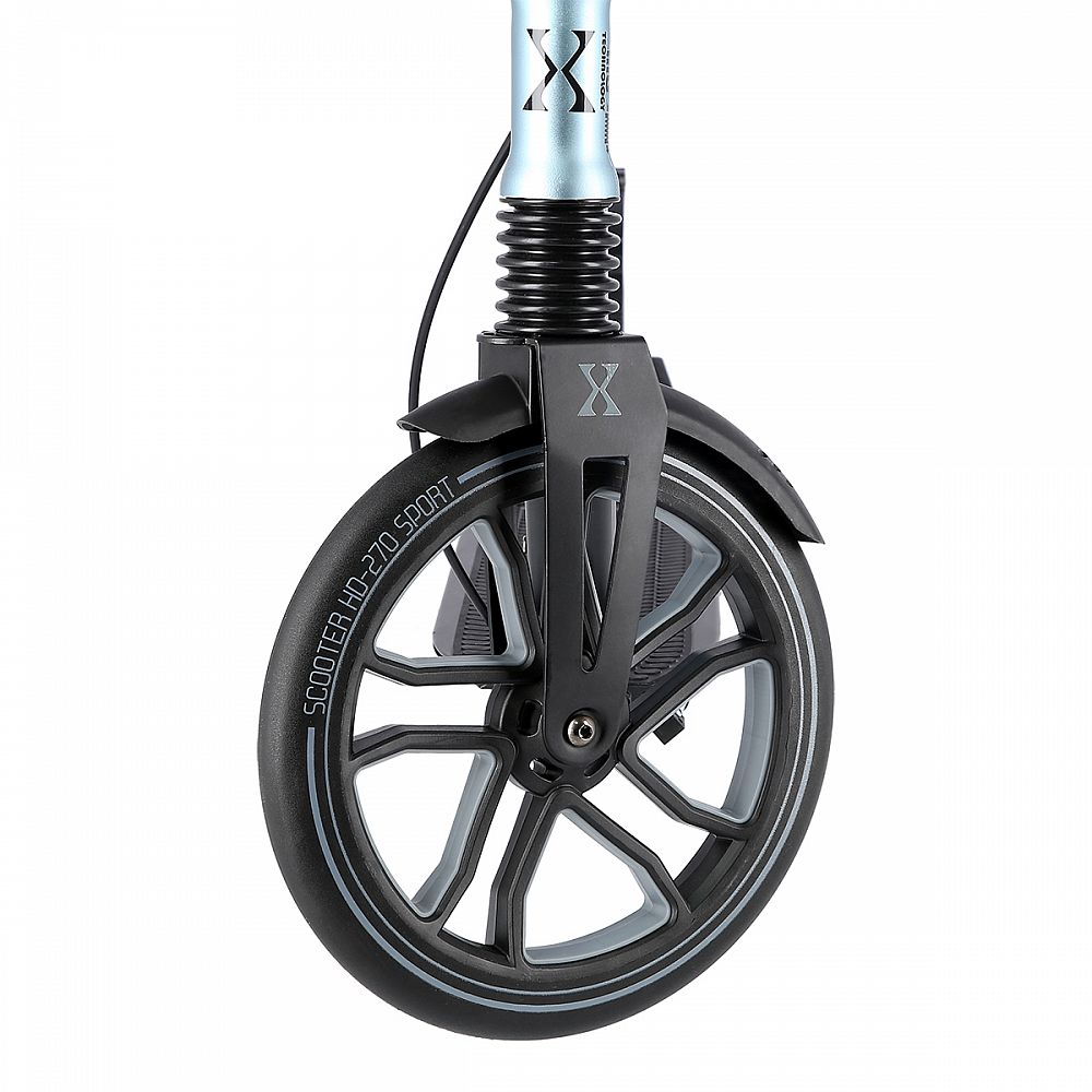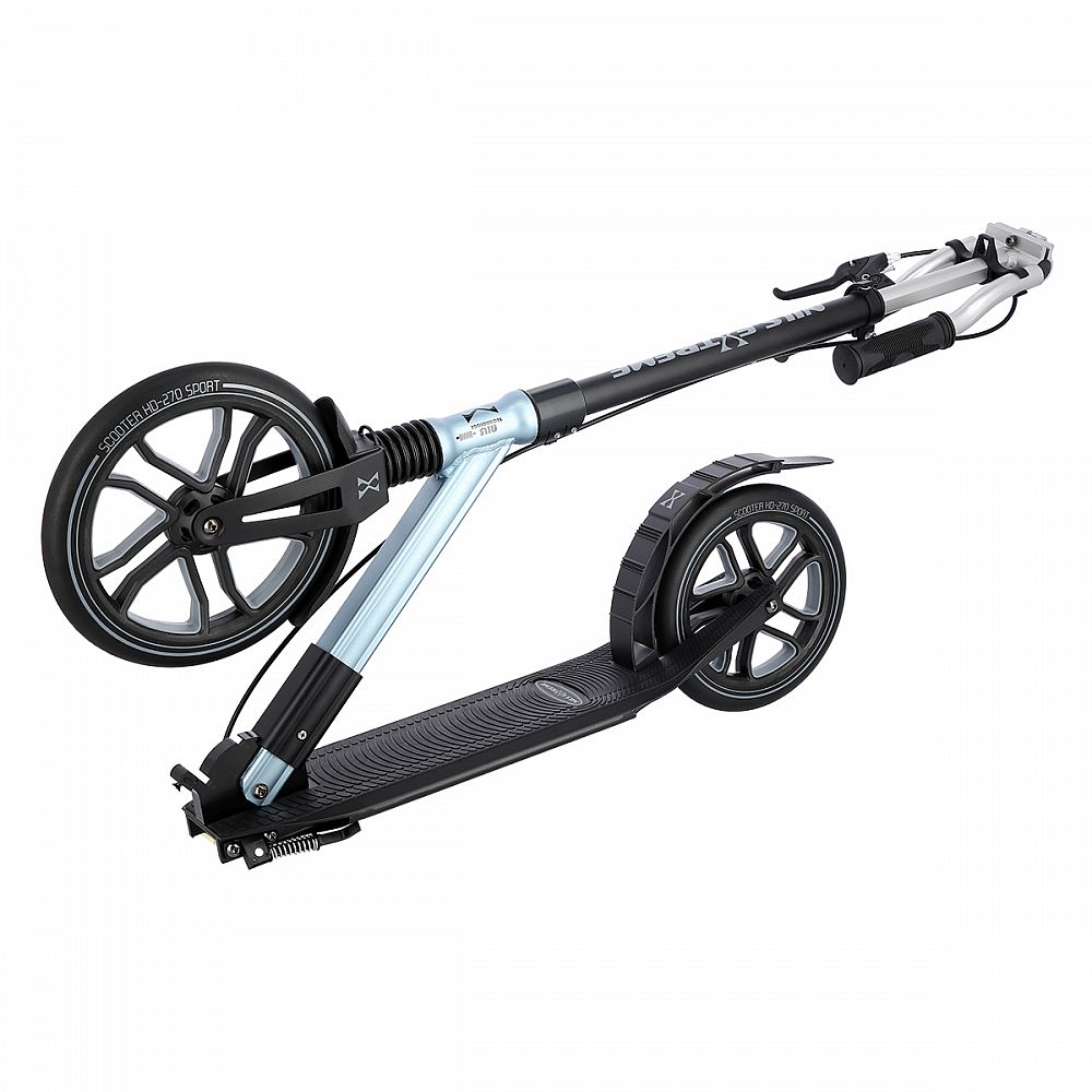 Systém odpruženia predného kolesa zvyšuje jazdný komfort. Tlmič pohlcuje nárazy a jazda po nerovnom asfalte, alebo dlažobných kockách je príjemnejšie a tichšiu. Robustný zadný blatník slúži ako nožný, prítlačná brzda, pod blatníkom sa skrýva samostatná, malá brzda, ktorá je ovládaná páčkou z riadidiel. Široká riadidlá sú opatrené gumovými rukoväťami, ktoré zaisťujú pevný a pohodlný úchop. 270 a 230 milimetrov veľké kolesá sú osadené ložiskami ABEC 7. Táto kombinácia zabezpečuje rýchlu, plynulú a bezpečnú jazdu. Blatník na prednom kolese a skladacie stojanček sú drobnosťami, ktoré přizpívají k maximálnemu možnému komfortu z jazdy a k celkovej radosti zo samotného použivania modelu MH270.