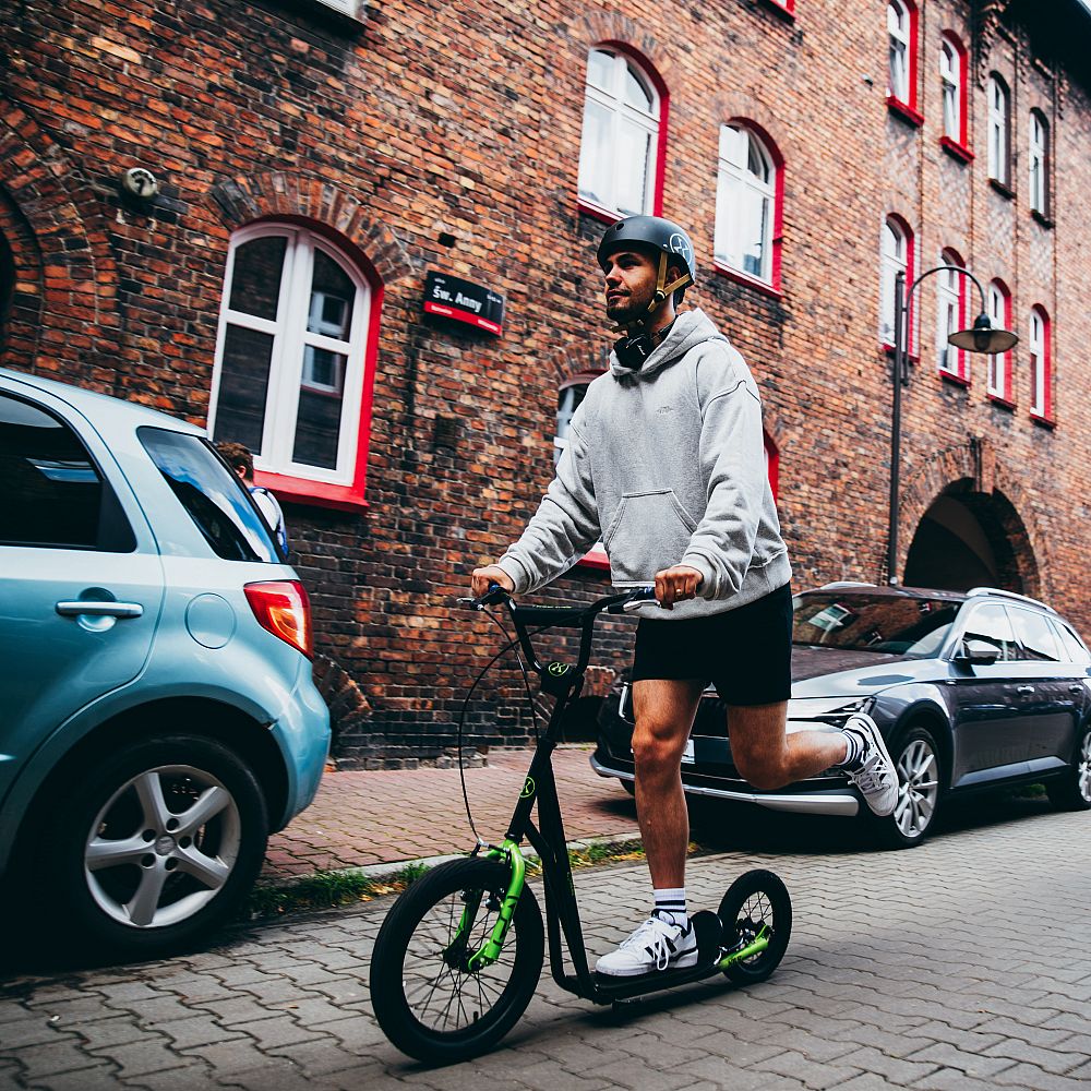 Rám kolobežky je vyrobený z hliníkovej zliatiny, ktorá kombinuje ľahkosť s odolnosťou proti mechanickému poškodeniu. Dopĺňajú ho oceľové riadidlá, ktoré zaisťujú tuhosť a stabilitu pri jazde. Napriek robustnej konštrukcii váži kolobežka iba 8,5 kg, čo uľahčuje jej prenášanie, prepravu a každodenné používanie - napríklad pri ceste do školy, do práce alebo na stretnutie s priateľmi.