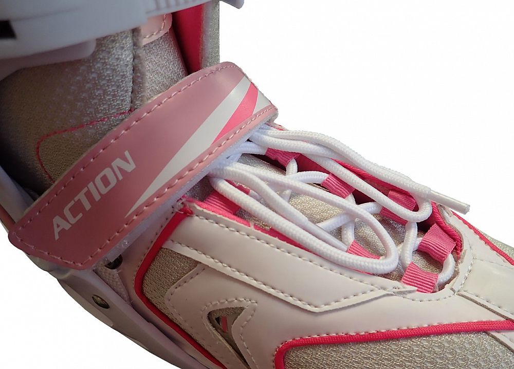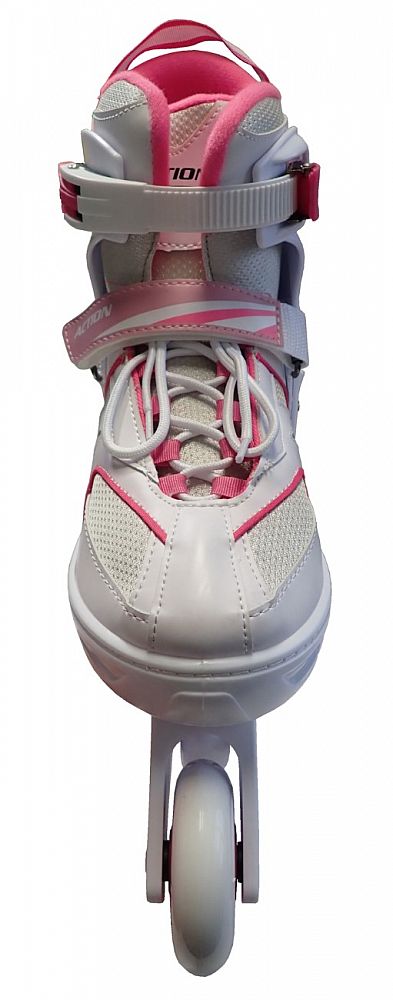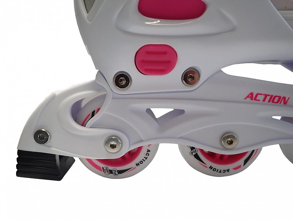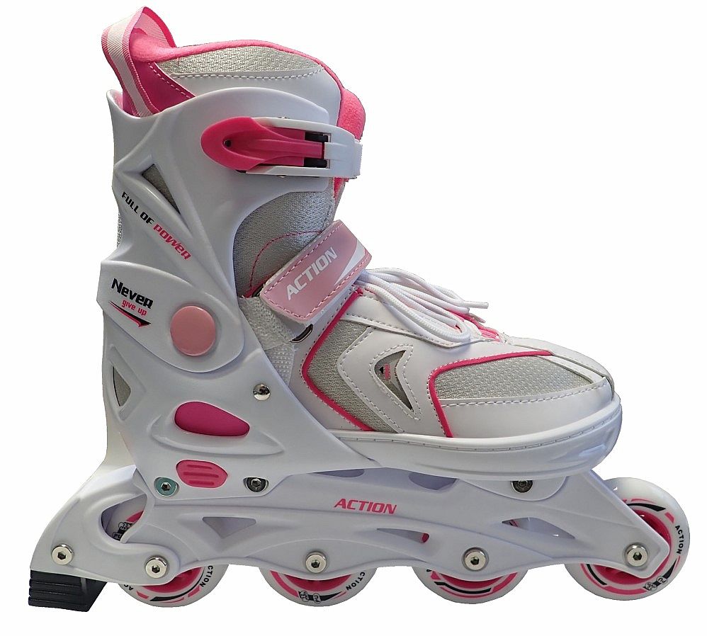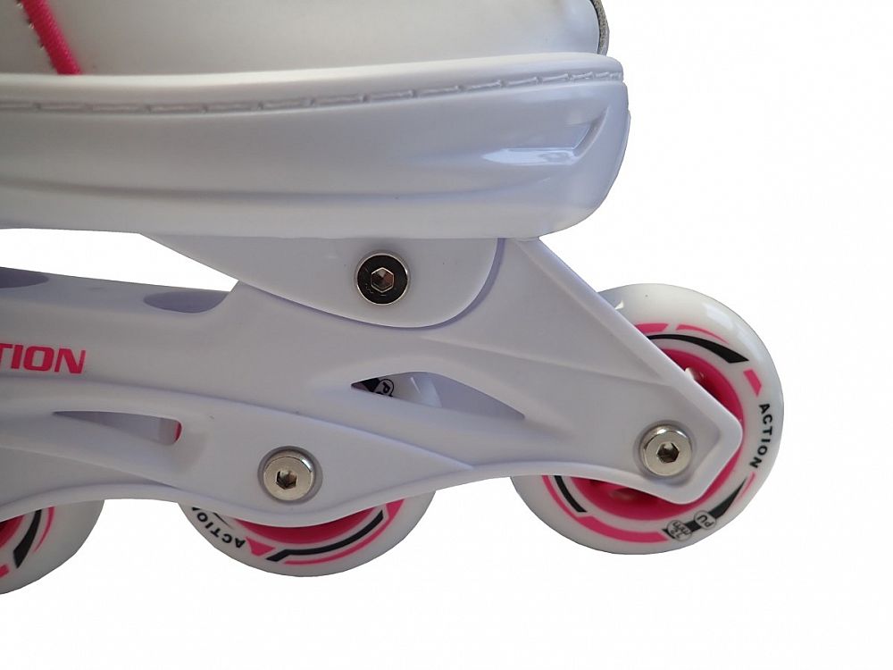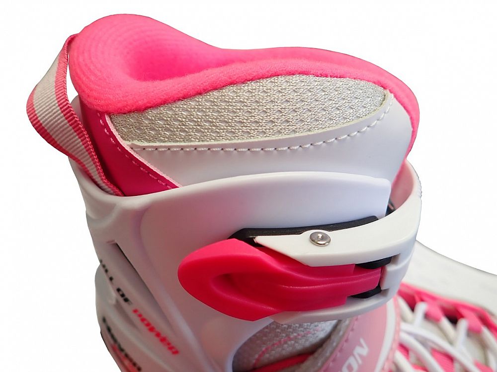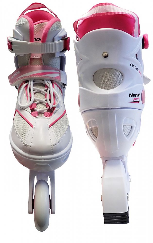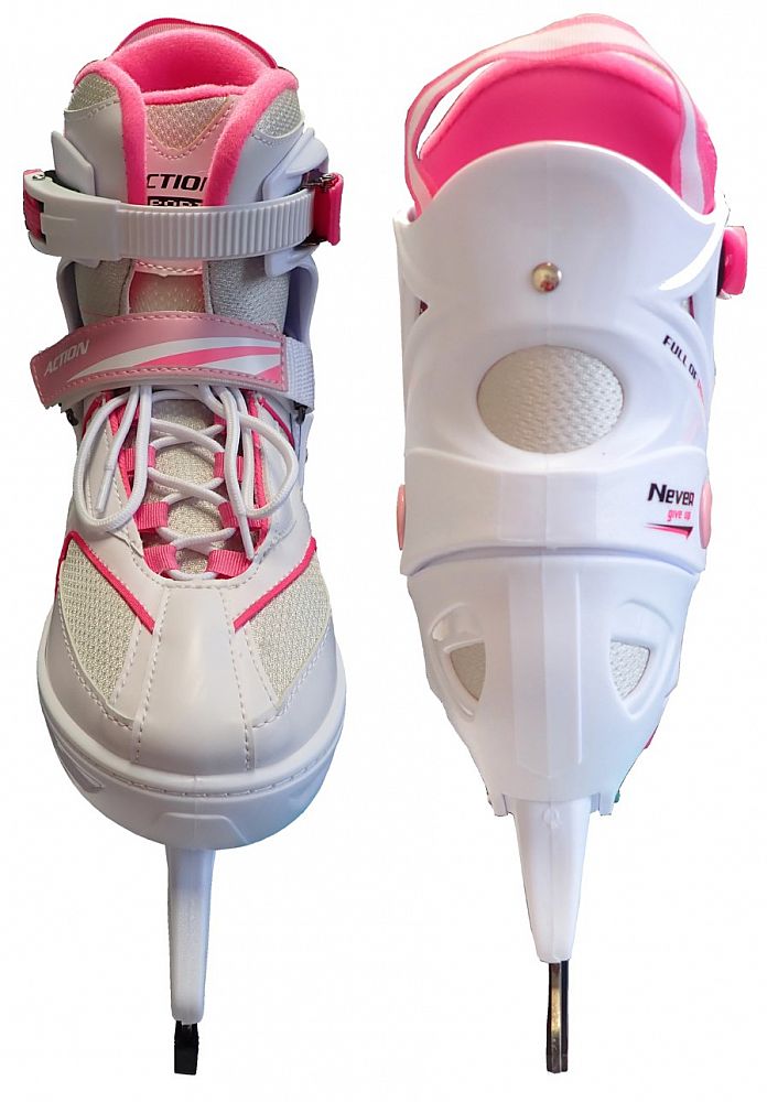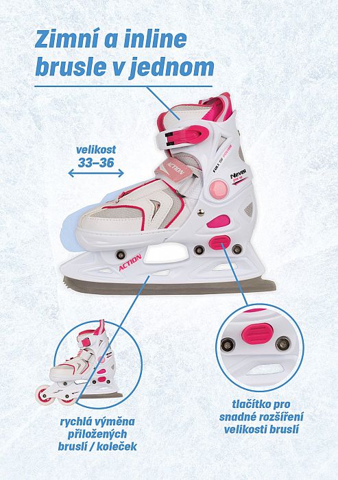 Priložené dva podvozky umožňujú univerzálne meniť kolieskové korčule so zimnými korčulami - mäkká šnurovacia topánka s prackou a sťahovacím pásikom na suchý zips, vnútorná výplň s "pamäťou", ložiská ABEC - 5, spevnený plastový podvozok, PU vrstvené kolieska 73 x 73 = 21 – 22,5 cm.
