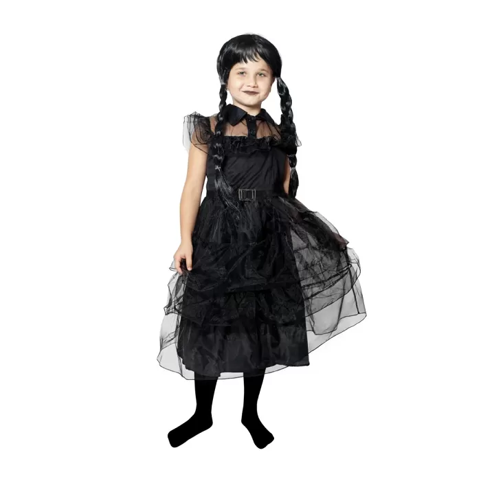 Kostým oblíbené Wednesday Addams vás promění a vtáhne do role této postavy.  Krásné černé šaty jako plesové šaty v oblíbeném seriálu Wednesday. Skvělý kostým na karneval, tématické oslavy nebo na Halloween. Velikost:M - 6 - 8 let (117 - 128 cm)Materiál: polyesterBalení: 1 ks šatů Kostým neobsahuje paruku, boty ani podkolenky.