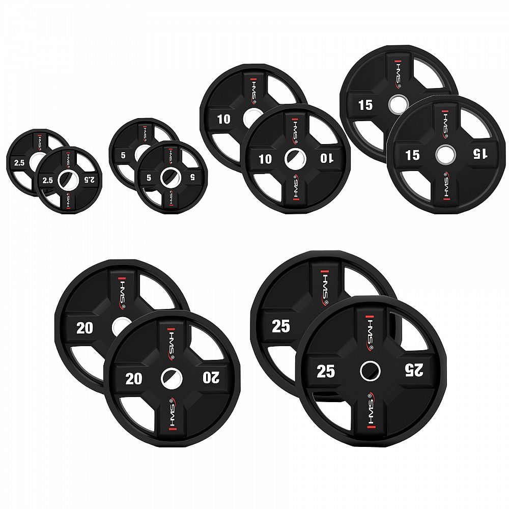 Popis: Súprava olympijských polyuretánových kotúčov HMS TPC set 2 x 2,5 - 25 kg