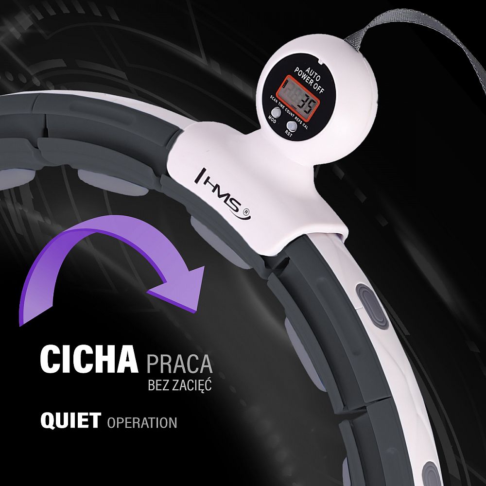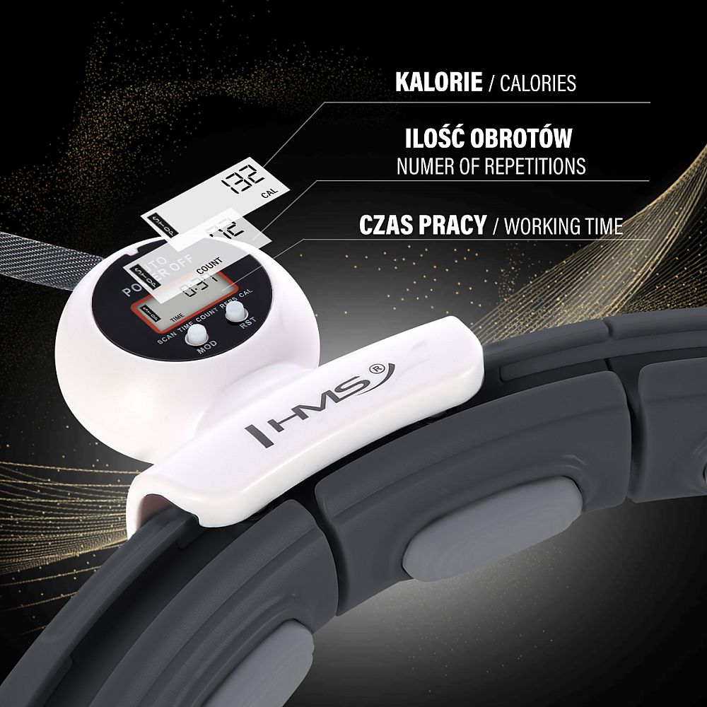 HMS HHM15 je hula hoop obruč s nastaviteľným obvodom, masážnymi magnetickými výstupkami, rotujúcim závažím a počítadlom.