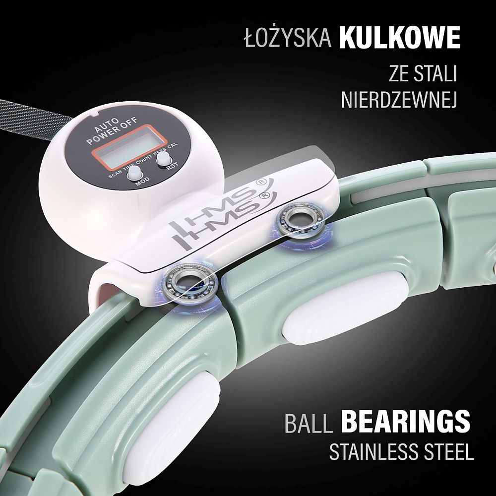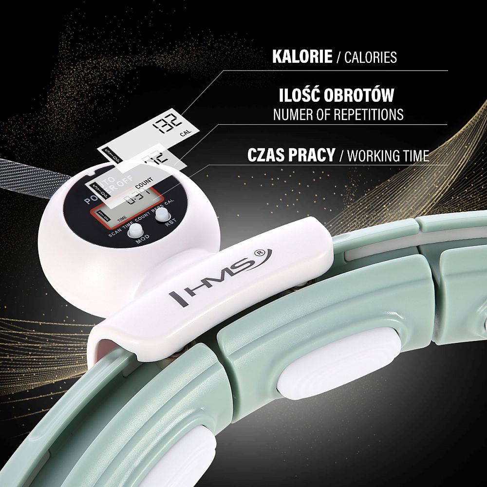 HMS HHM15 je hula hoop obruč s nastaviteľným obvodom, masážnymi magnetickými výstupkami, rotujúcim závažím a počítadlom.