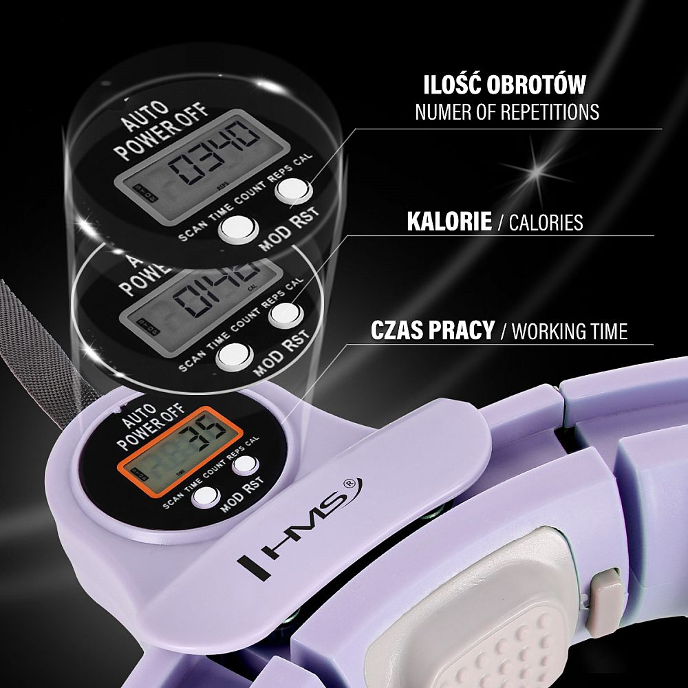 HMS HHM13 je hula hoop obruč s nastaviteľným obvodom, masážnymi výstupkami, blokom pre magnetickú masáž rotujúcim závažím a prehľadným počítadlom.