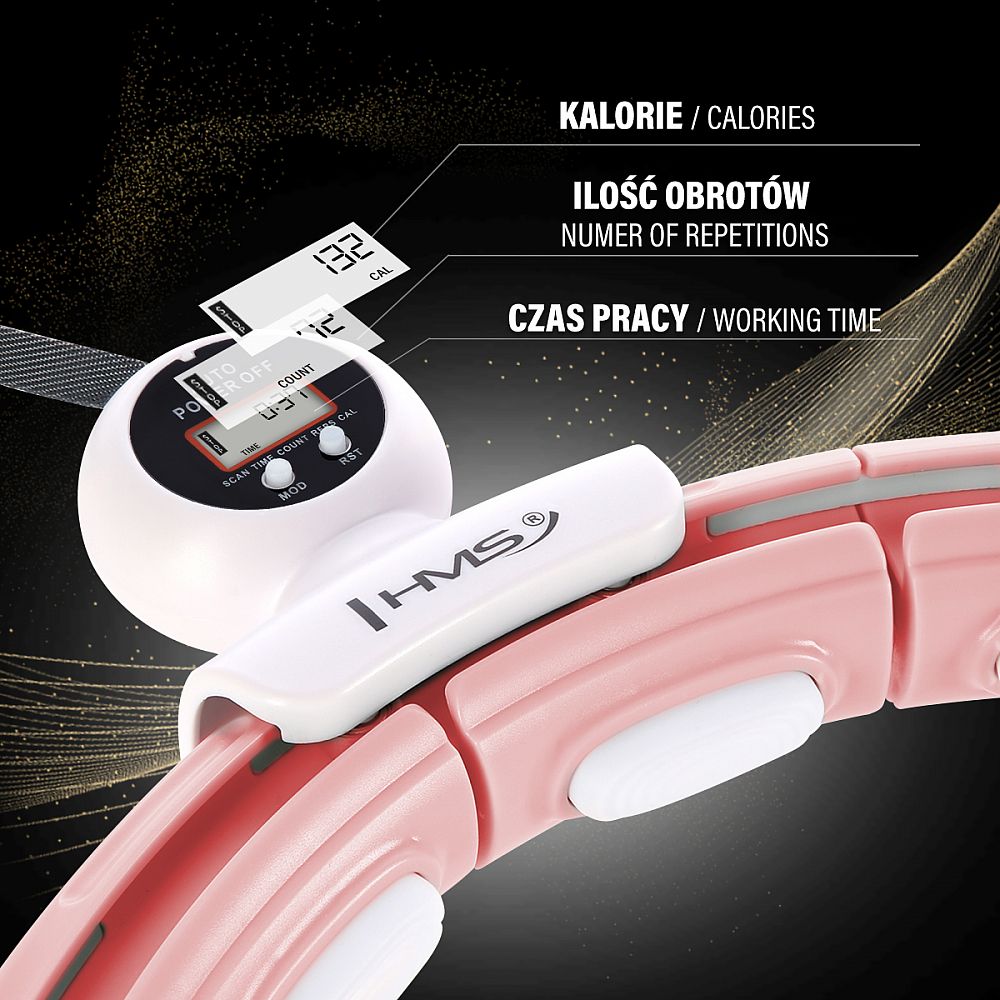 HMS HHM15 je hula hoop obruč s nastaviteľným obvodom, masážnymi magnetickými výstupkami, rotujúcim závažím a počítadlom.