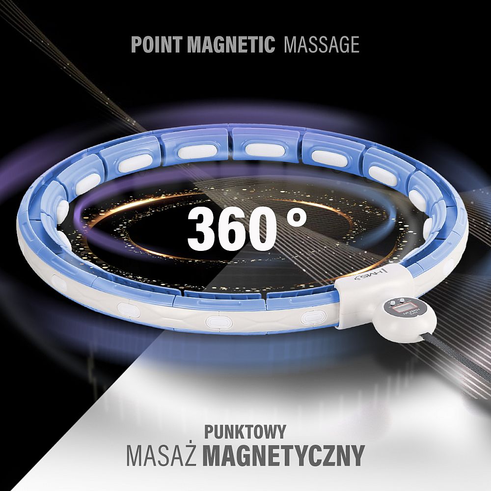 HMS HHM15 je hula hoop obruč s nastaviteľným obvodom, masážnymi magnetickými výstupkami, rotujúcim závažím a počítadlom.