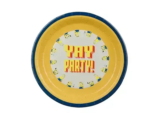 Papierové taniere Mimoni sú praktickým a štýlovým doplnkom pre každú detskú oslavu s motívom Mimoni. Žlté tanieriky s tmavomodrým lemom zdobia mini obrázky mimoňov a veselý nápis „Yay party!“, ktorý dodá celej oslave hravú atmosféru. Vďaka väčšej veľkosti sú papierové taniere Mimoni ideálne nielen na narodeninovú tortu, ale aj na chipsy, sladkosti a ďalšie občerstvenie. Skvele sa hodí na detské narodeninové párty, tematické oslavy Mimoni aj iné veselé akcie pre deti. Papierové taniere Mimoni perfektne doplnia ďalšie party výzdobu v rovnakom štýle a pomôžu vytvoriť jednotný a zábavný vzhľad celej oslavy.