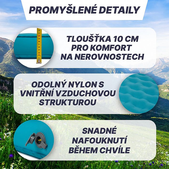 - Vhodná na kempovanie aj turistiku: Vďaka svojej kompaktnosti a nízkej hmotnosti je karimatka ideálna na kempovanie aj turistiku. Poskytne vám maximálne pohodlie aj na tých najdlhších a najnáročnejších trasách.