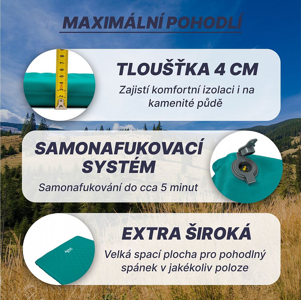 - Rýchle a ľahké nafúknutie: Karimatka sa sama nafúkne počas cca 5 minút, takže si budete môcť užívať pohodlie v okamihu. V prípade potreby ju môžete dofúknuť ústami na dosiahnutie optimálnej tuhosti.