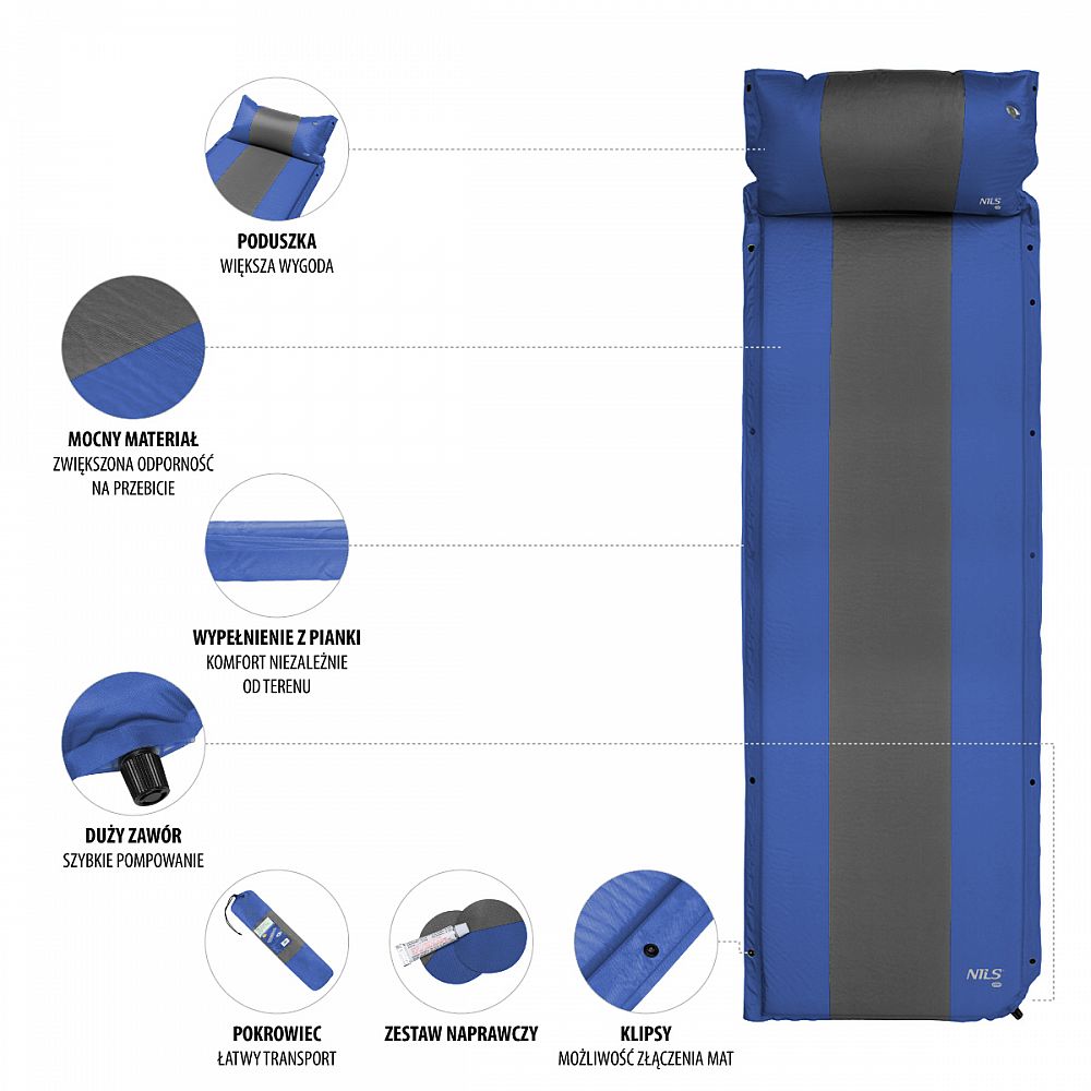Samonafukovacia karimatka NILS CAMP NC4349 zaistí kvalitný spánok počas kempovania a dovoleniek pod stanom. Podložka je ale vhodná aj k vode a všade tam, kde si chcete príjemne poležať. Samonafúknutie zaisťuje vnútorný, penový materiál s otvorenými pórmi. Po povolení ventilu do seba nasáva vzduch a dostáva sa tak do pôvodného stavu. Záverom je ešte potrebné podložku dofúknuť na požadovanú tvrdosť. Skladanie sa vykonáva otvorením ventilu a zrolovaním od opačnej strany, než je ventil. Karimatku potom zaistíme remienkami s prackami a vložíme do dodávaného vaku. Na model NC4349 bol použitý veľmi odolný polyester 75D potiahnutý vrstvou PVC, táto kombinácia zaisťuje vysokú odolnosť a karimatka sa dá položiť aj na nerovný povrch. Lemy karimatky sú opatrené cvočkami, ktoré umožňujú spojiť viac matracov do jednej, veľkej plochy, toto sa hodí napríklad na vyplnenie podlahy v stane. Vankúšik nie je odnímateľný a oproti karimatke nie je vyplnený penou a je potrebné ho celý nafúknuť. Súčasťou balenia je aj opravná sada, ktorá sa hodí v prípade poškodenia.