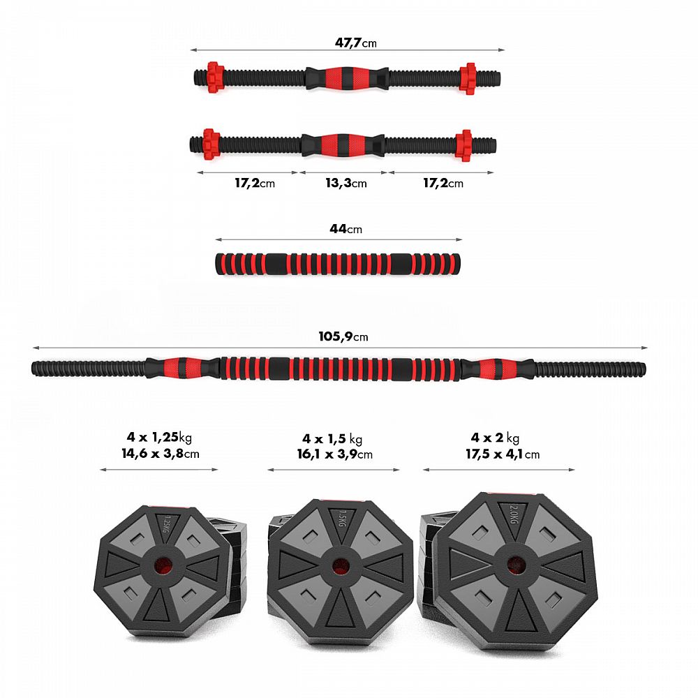 Kotúče sú vyrobené z tvrdého plastu, ktorý je vyplnený cementom. Obojručná os je spojovacím dielom, do ktorého sa vskrutkujú hriadele jednoručných činiek. Nakladacie tŕne sú opatrené závitom a závažie sa zaisťuje pomocou hviezdicových matíc. Šesťhranný tvar kotúčov navyše zamedzuje ich odvaľovaniu. Činky sa Vám tak nikam neodkotúlia a budete ich mať vždy tam, kde ste ich odložili.