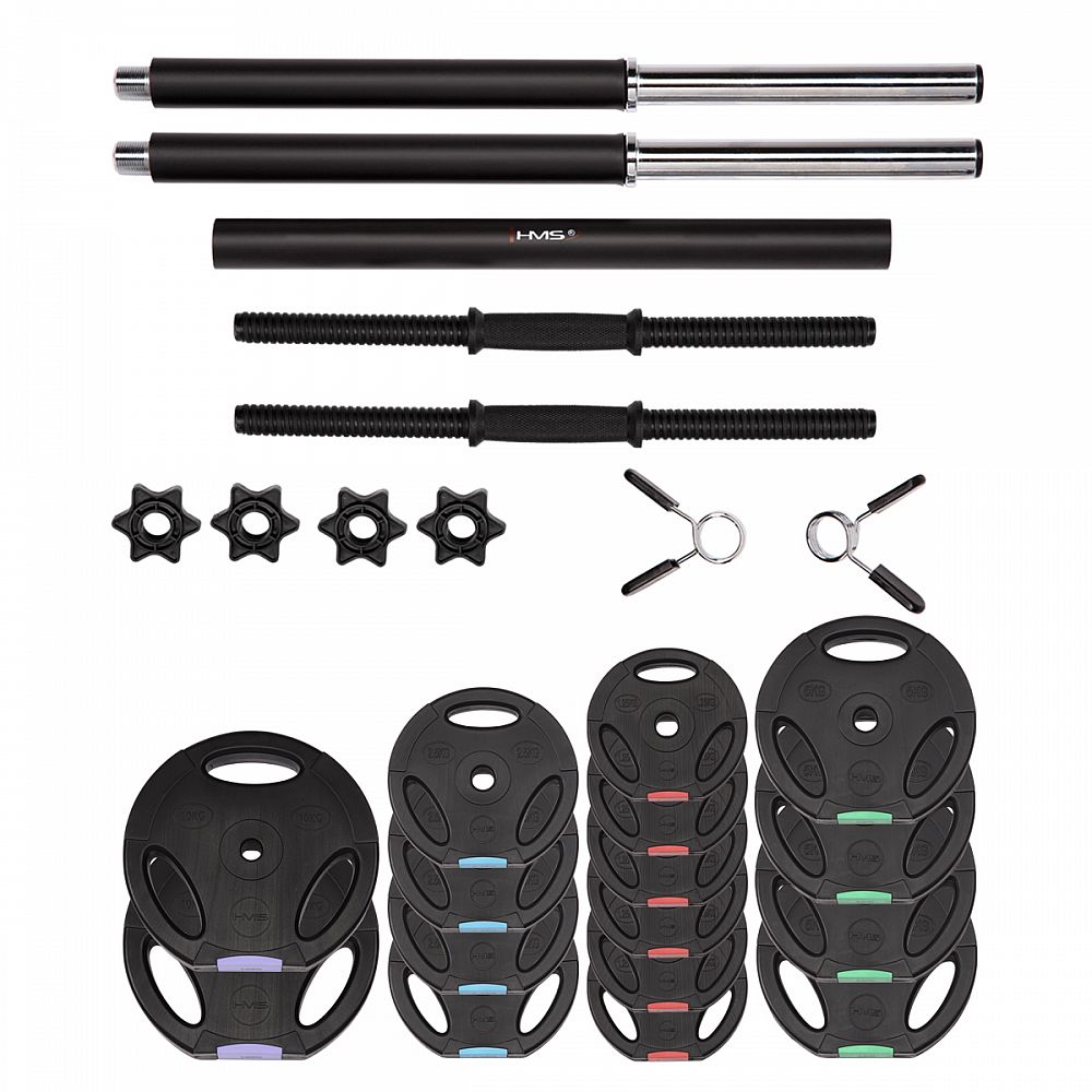 Kompletná nakladacia sada dvoch jednoručných a jednej obojručnej činky s celkovou hmotnosťou 62 kilogramov, to je HMS SGSP60. Nakladacie činky patria ku klasickému vybaveniu každej domácej posilňovne.