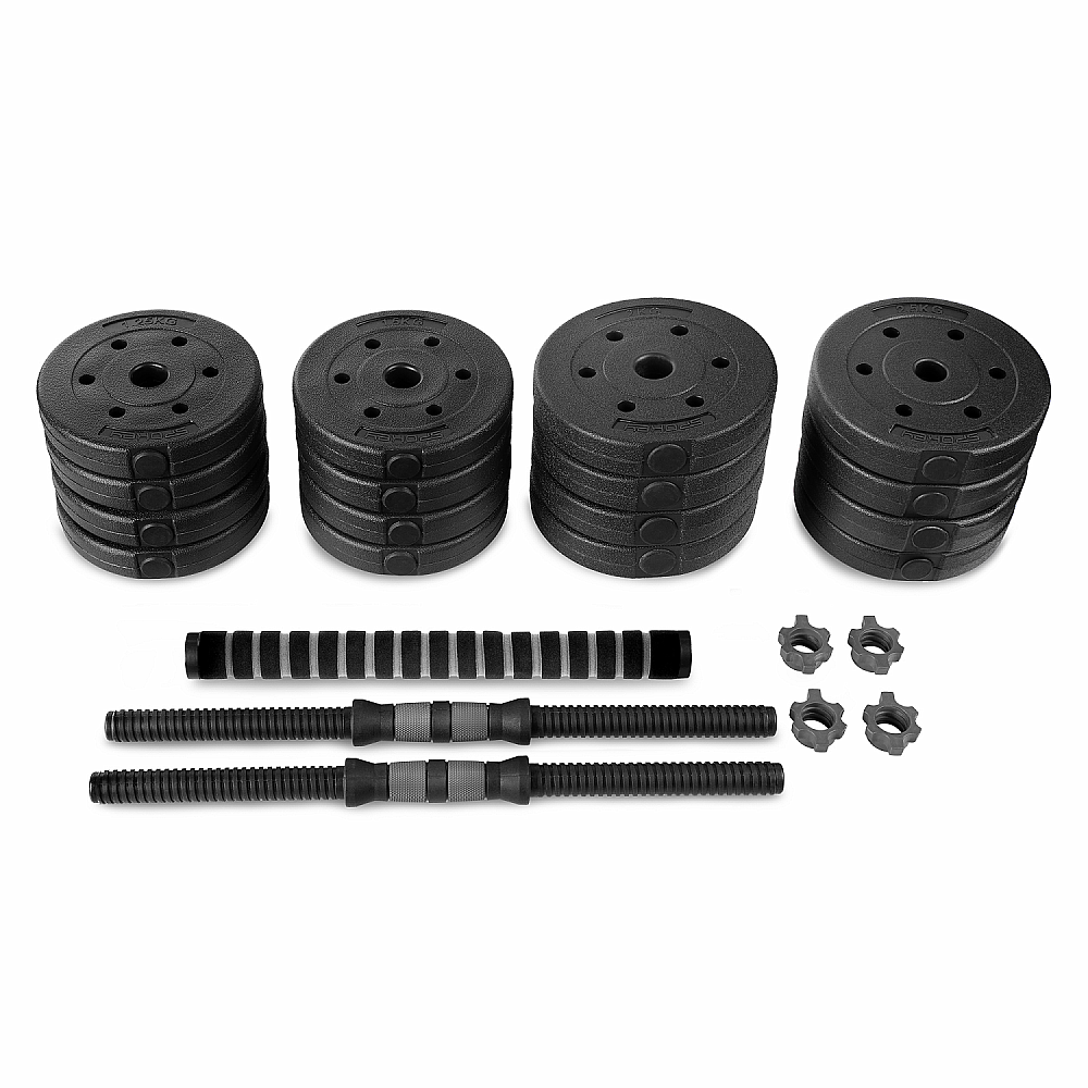 Spokey PONDUS 30: dve nakladacie činky a obojručná činka v jednej sade