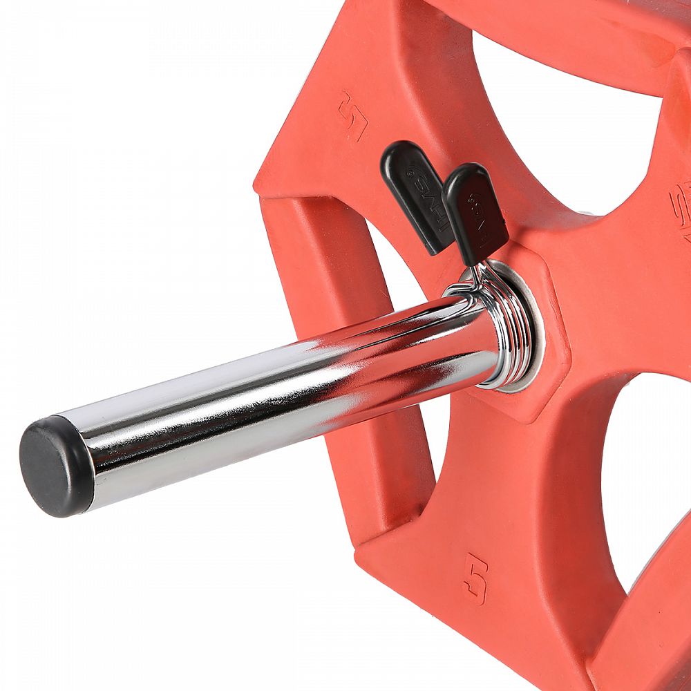 Svorky sú vyrobené z 3 milimetrov hrubého, oceľového drôtu. 3 závity zaisťujú dostatok prítlačnej sily aj pre dynamický tréning. "Kridielka" sú naklopené na jednu stranu, takže objímku ide nasadiť úplne ku kotúču, tým dochádza k lepšiemu zaisteniu, než u podobných svoriek, ktoré majú "krídielka" v osi objímky. Plastové krytky zvyšujú pohodlie pri manipulácii so svorkami.