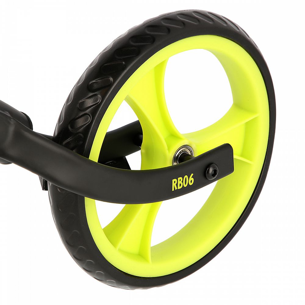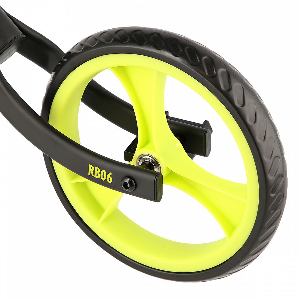 Konštrukcia RB06 je vyrobená z kvalitnej, lakovanej ocele. Pre maximálnu bezpečnosť sú všetky hrany zaoblené. Rukoväte sú osadené gripy s golierom na oboch stranách, ktorý zamedzuje skĺznutiu dlane. Stredové zloženie je vypavené zarážkou, ktorá zamedzuje pretočeniu riadidiel. Plastové kolesá sú osadené 9", plnou pneumatikou, ktorá sa nedá preraziť. Ložiská ABEC 9 zaručujú plynulú jazdu. Riadidlá a sedlo sú výškovo nastaviteľné.