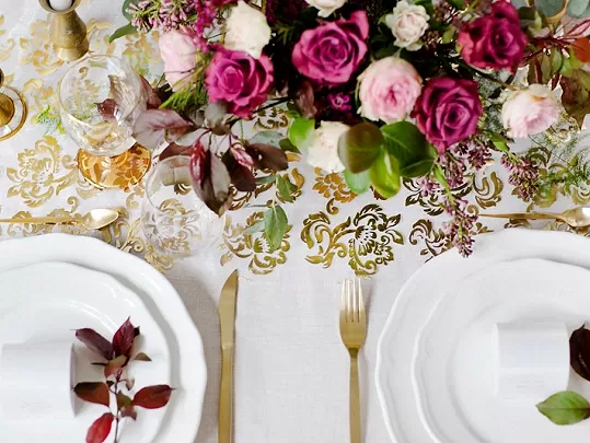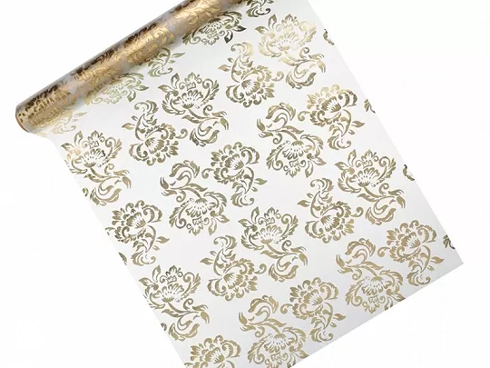 Potlačená organza v bielej farbe, potlač je zlatá na jednej a strieborná na druhej strane.