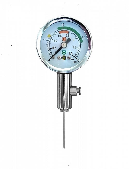 Kovový merač tlaku lôpt s vypúšťacím ventilom Sedco je kvalitný a presný merač tlaku lôpt. Pod budíkom je tlačidlo na vypúšťanie prehustených lôpt.