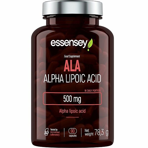 ESSENSEY ALA. Výživový doplnok. Prípravok v kapsuliach obsahujúci 250 mg kyseliny alfa-lipoovej v každej kapsuli. Alfa-lipoová kyselina je organická zlúčenina obsahujúca síru, ktorá sa nachádza v každej bunke ľudského tela.