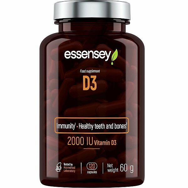 ESSENSEY D3. Výživový doplnok. Prípravok v kapsuliach obsahuje 2000 IU vitamínu D3 v odporúčanej dennej dávke. Vitamín D podporuje imunitu a prispieva k udržaniu normálneho stavu kostí a zubov.