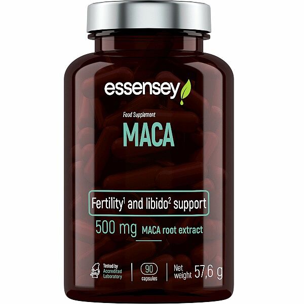 ESSENSEY MACA. Výživový doplnok. Prípravok v kapsuliach obsahujúci extrakt z koreňa peperovníka peruánskeho (Lepidium meyenii), obsahuje 500 mg extraktu v každej kapsuli. MACA má priaznivý vplyv na plodnosť. MACA pomáha udržiavať prirodzenú sexuálnu aktivitu a energiu.