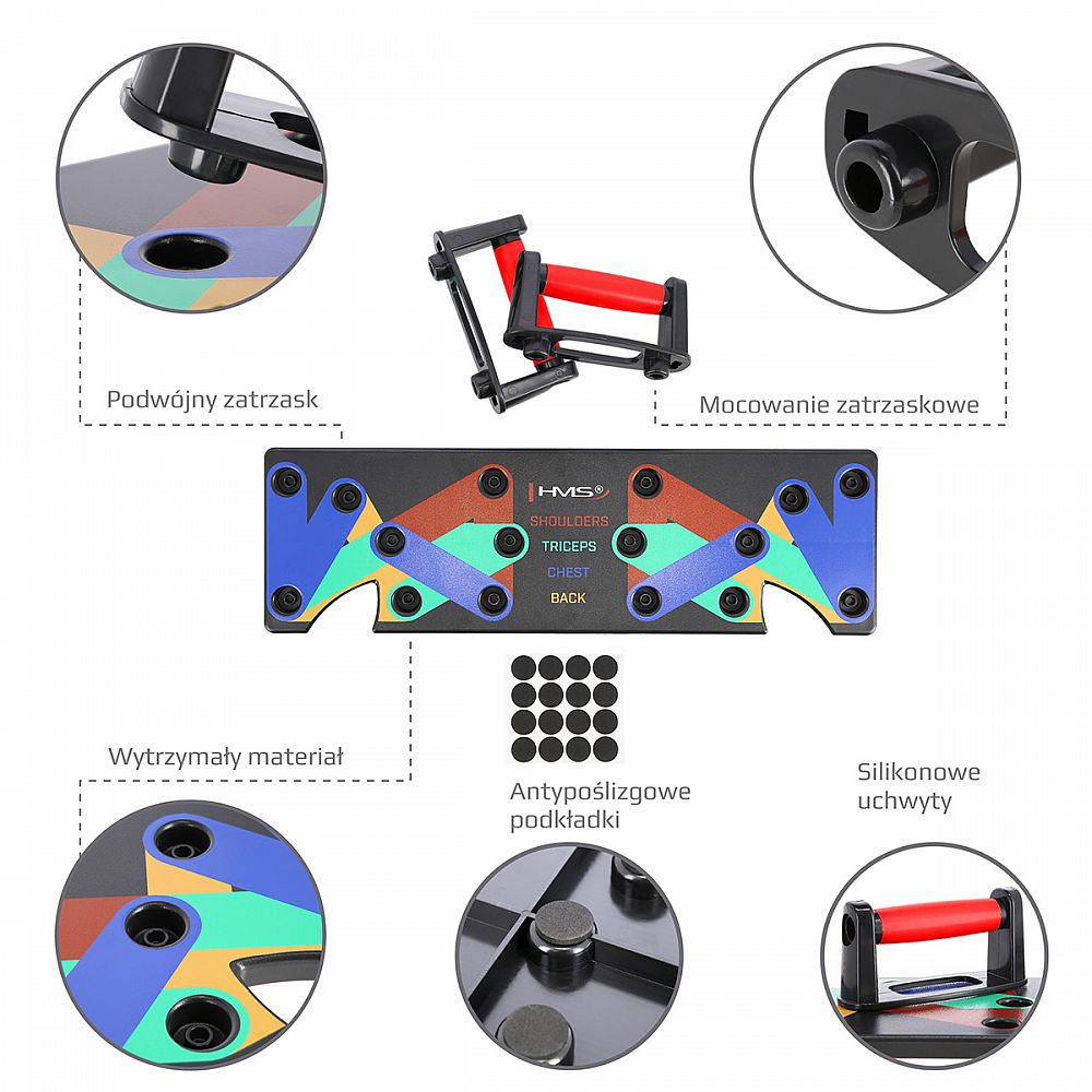 PU10 HMS je multifunkčný, skladacia doska, ktorá umožňuje variabilné tréning klikov. Doska je symetricky rozdelená na 2 polovice, kedy každá časť obsahuje 5 párov otvorov pre umiestnenie dodávaných podpier. Každý pár otvorov umožňuje tréning pod iným uhlom, kedy sa precvičuje iná svalová skupina a to: